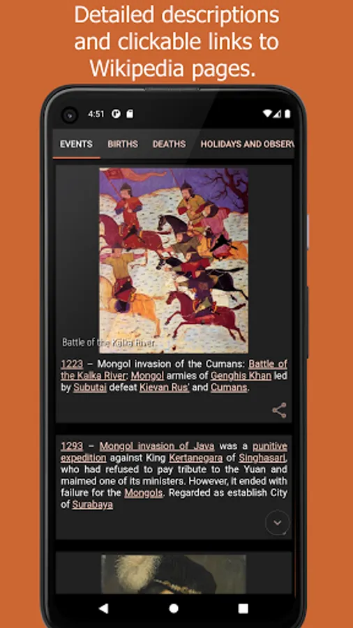 In addition, Today in History allows you to share historical events with your friends via popular social media apps, allowing you to spark interesting conversations and share your love for history with others.