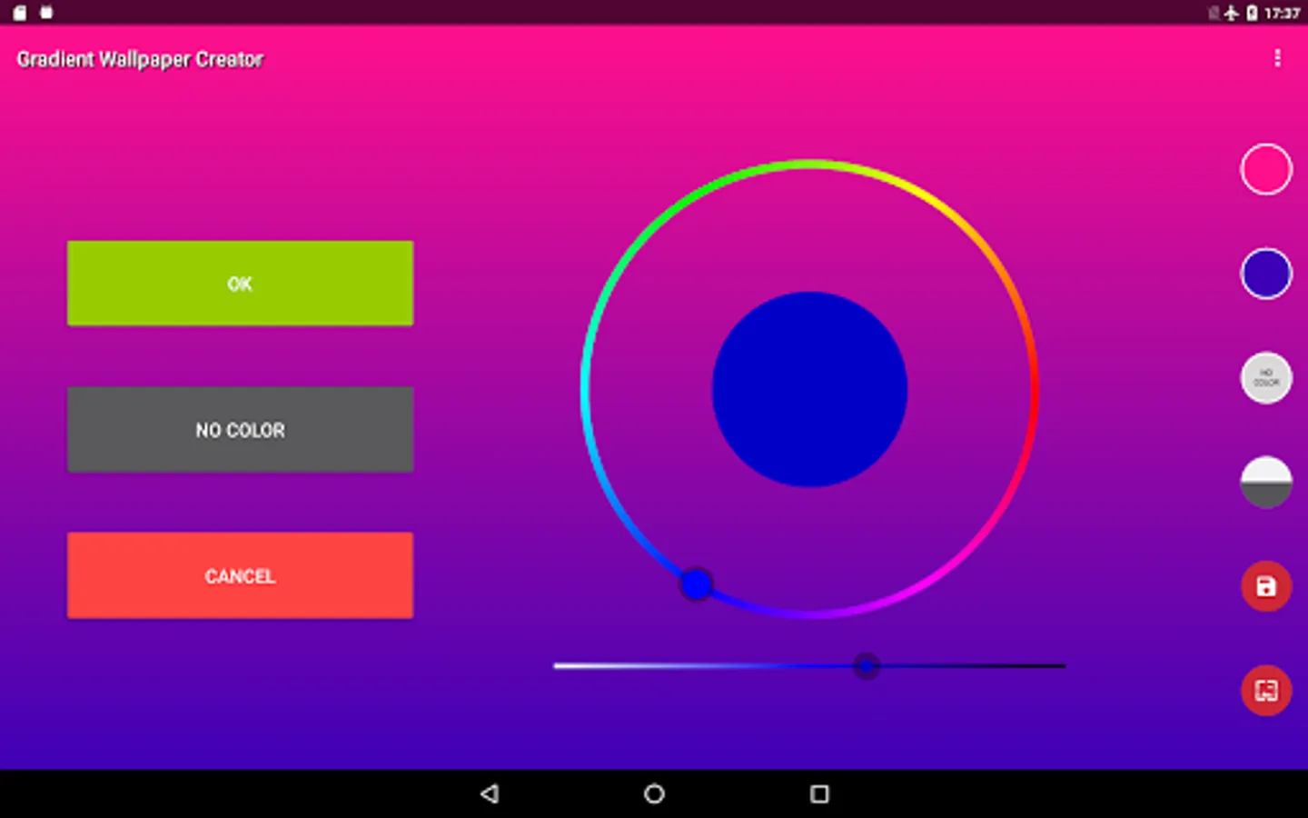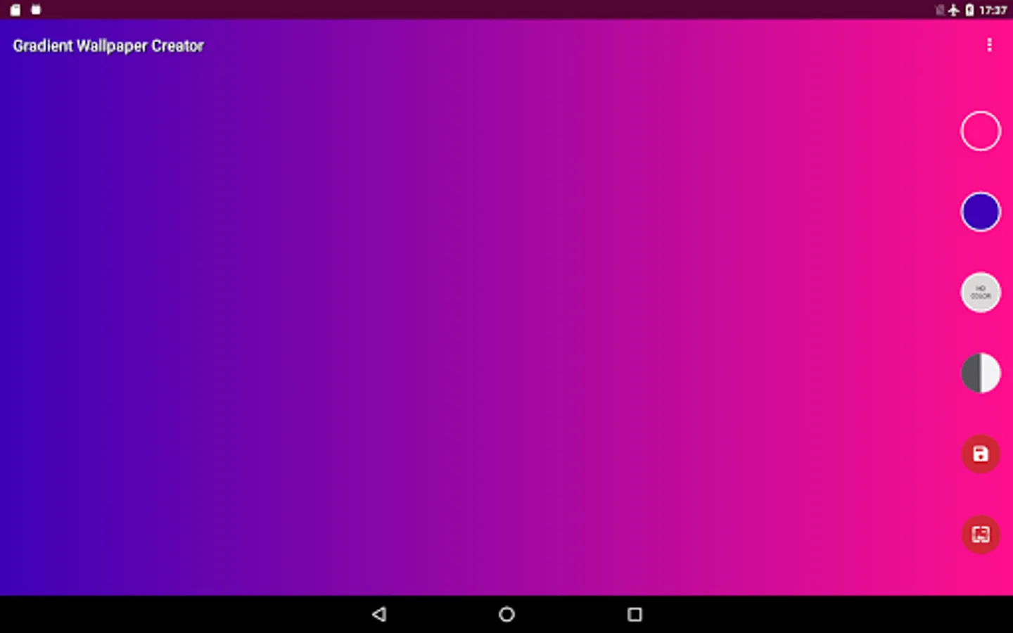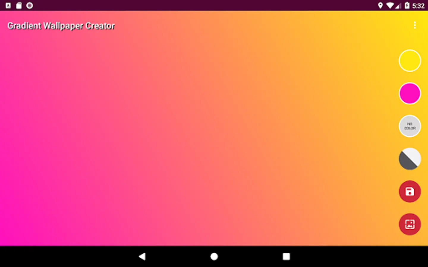 Gradient Wallpaper Creator will let you create stunning wallpapers for your phone and tablet. It's very intuitive and easy to use. Just pick favorite colors and orientation (horizontal, vertical, diagonal...) and the app will automatically create a gradient on your screen. You can save it, set as wallpaper or change it.