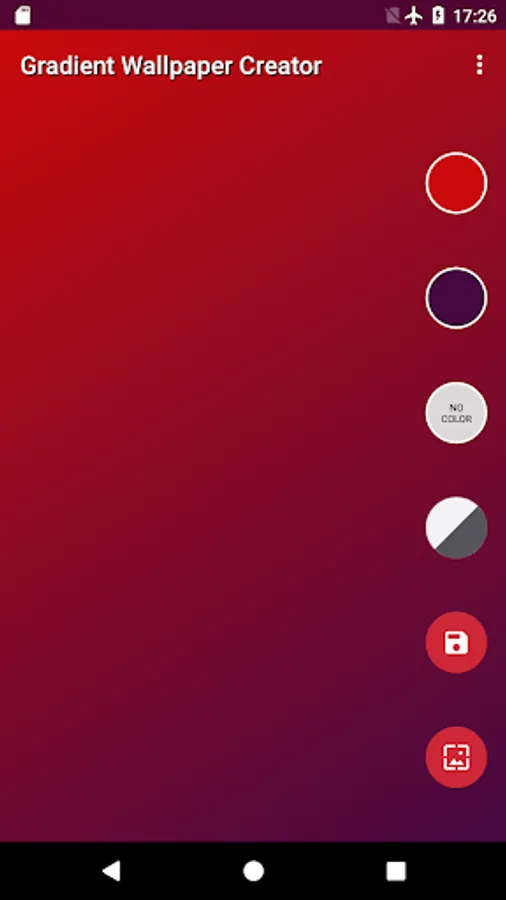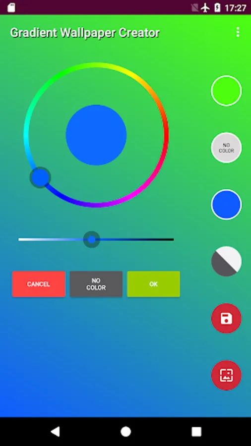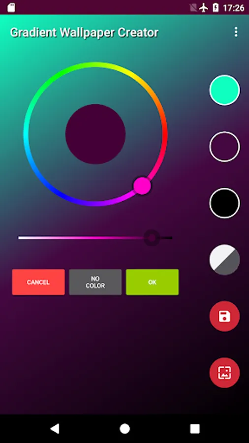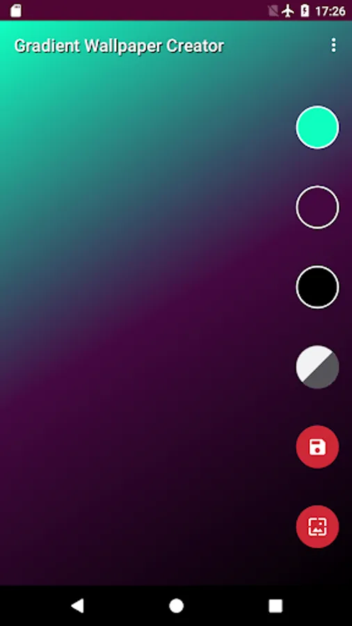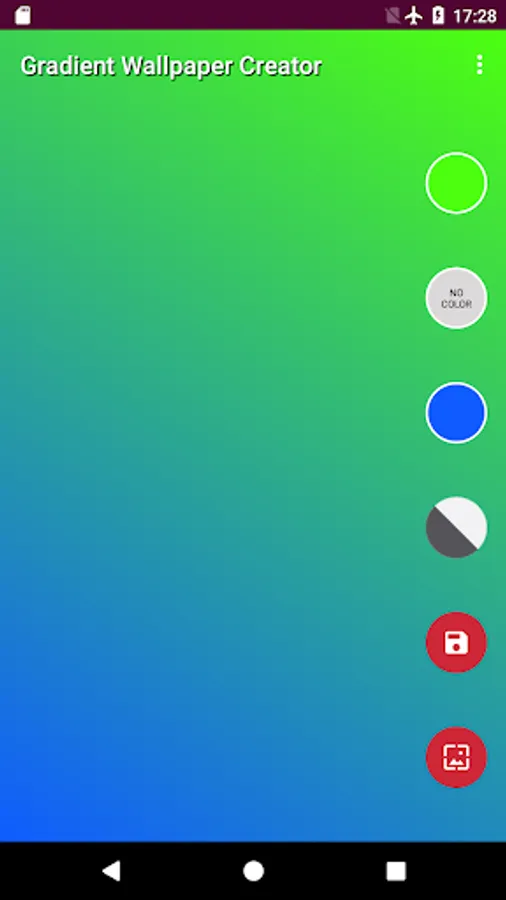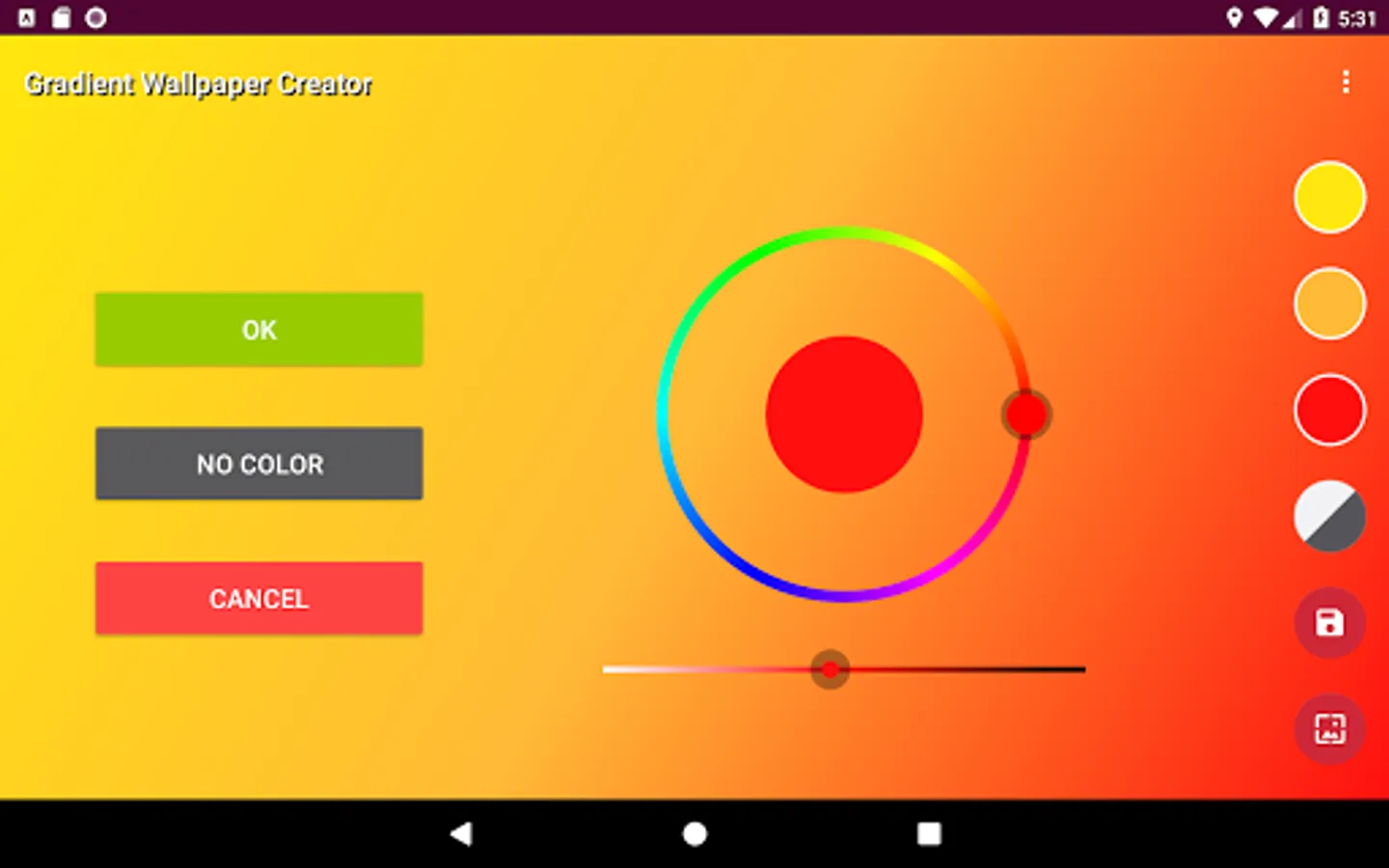 Gradient Wallpaper Creator will let you create stunning wallpapers for your phone and tablet. It's very intuitive and easy to use. Just pick favorite colors and orientation (horizontal, vertical, diagonal...) and the app will automatically create a gradient on your screen. You can save it, set as wallpaper or change it.