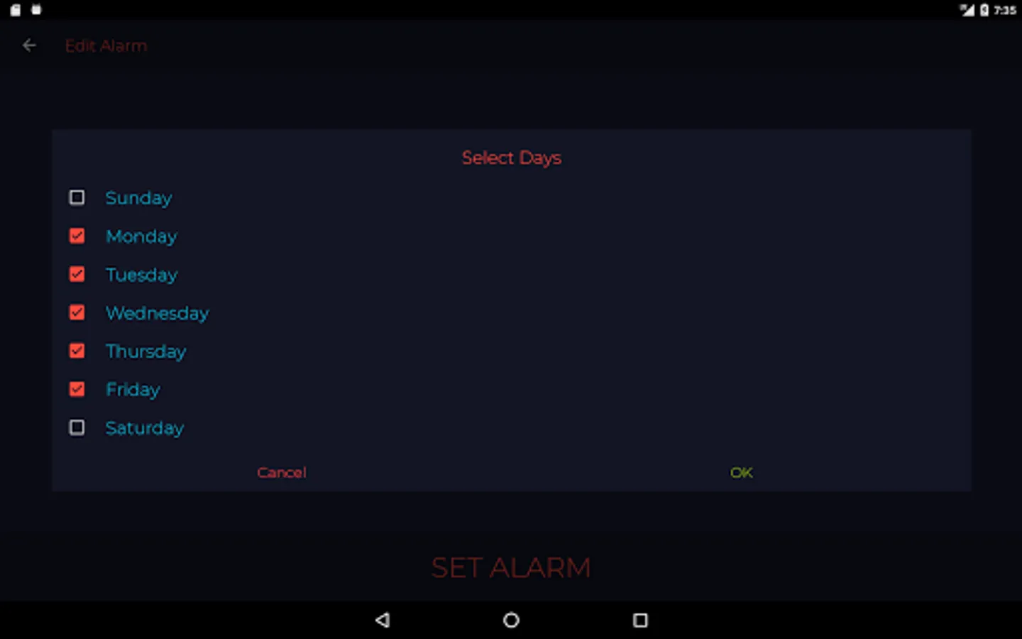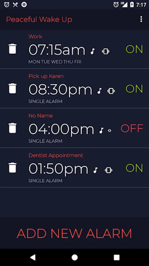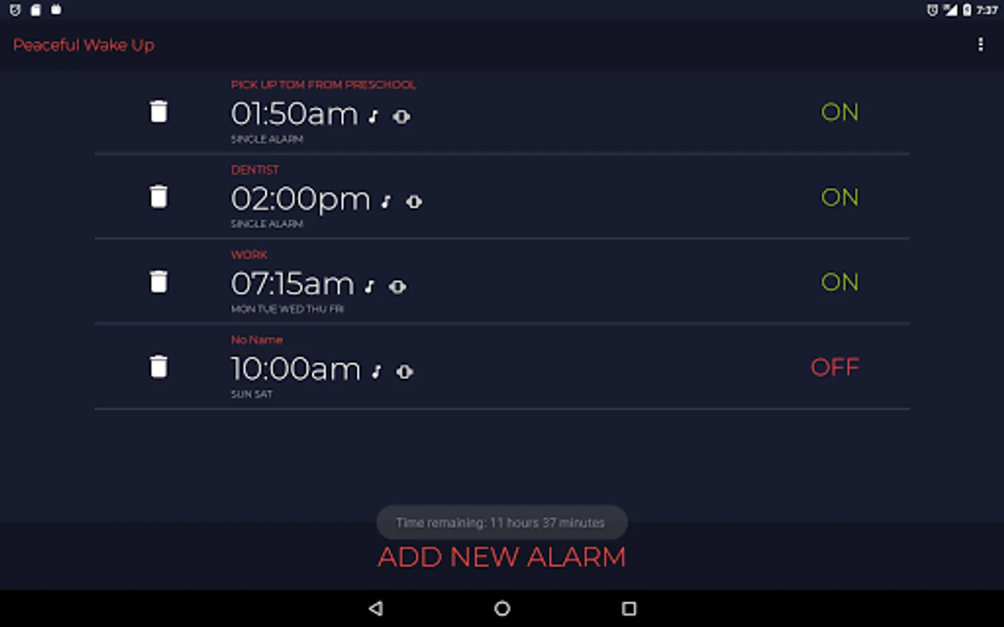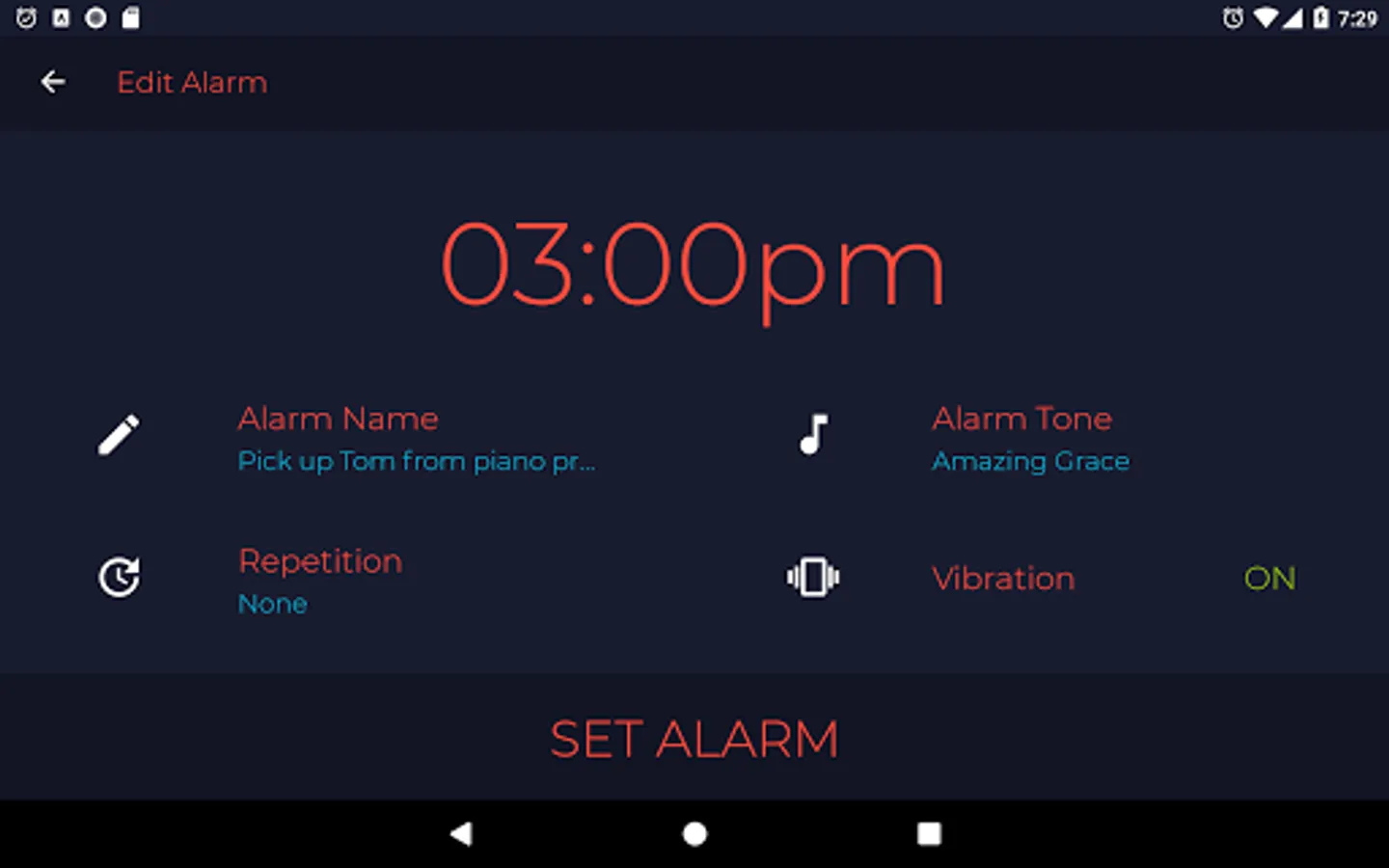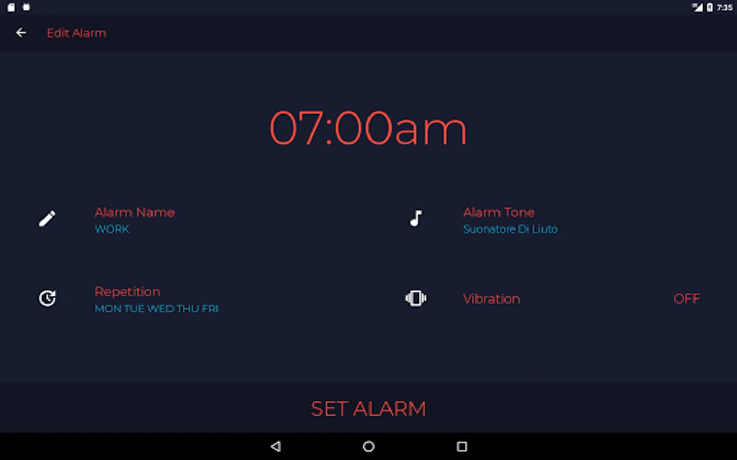 - you can schedule multiple alarms, each with different song or ringtone(or no sound at all), with or without vibration