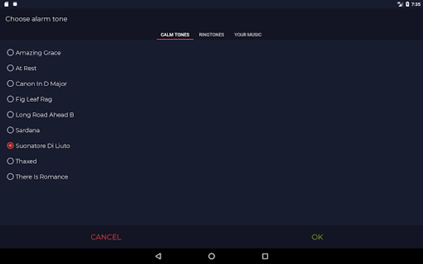 Instead of screeching alarm you can choose one of the soothing ringtones or just pick your favourite song. The app will slowly increase the volume until you dismiss it. The App is perfect for light-sleepers who don't need screeching, deafening alarm to wake up.