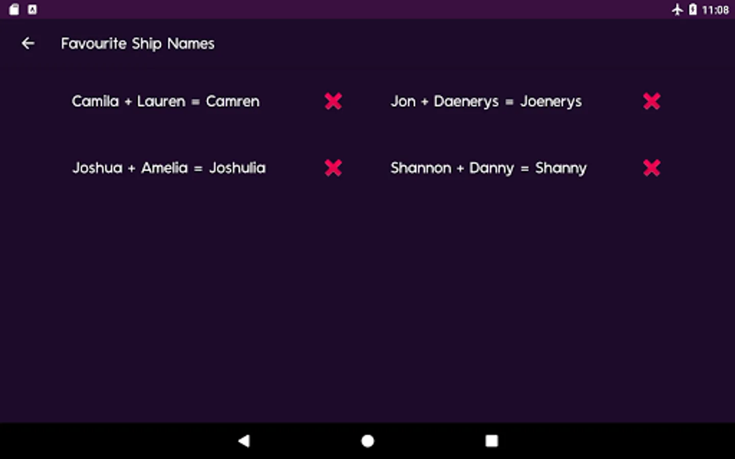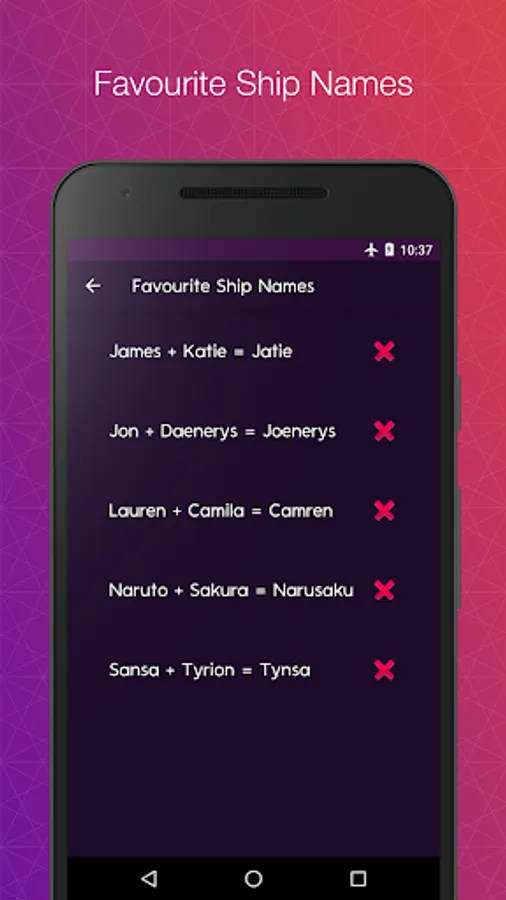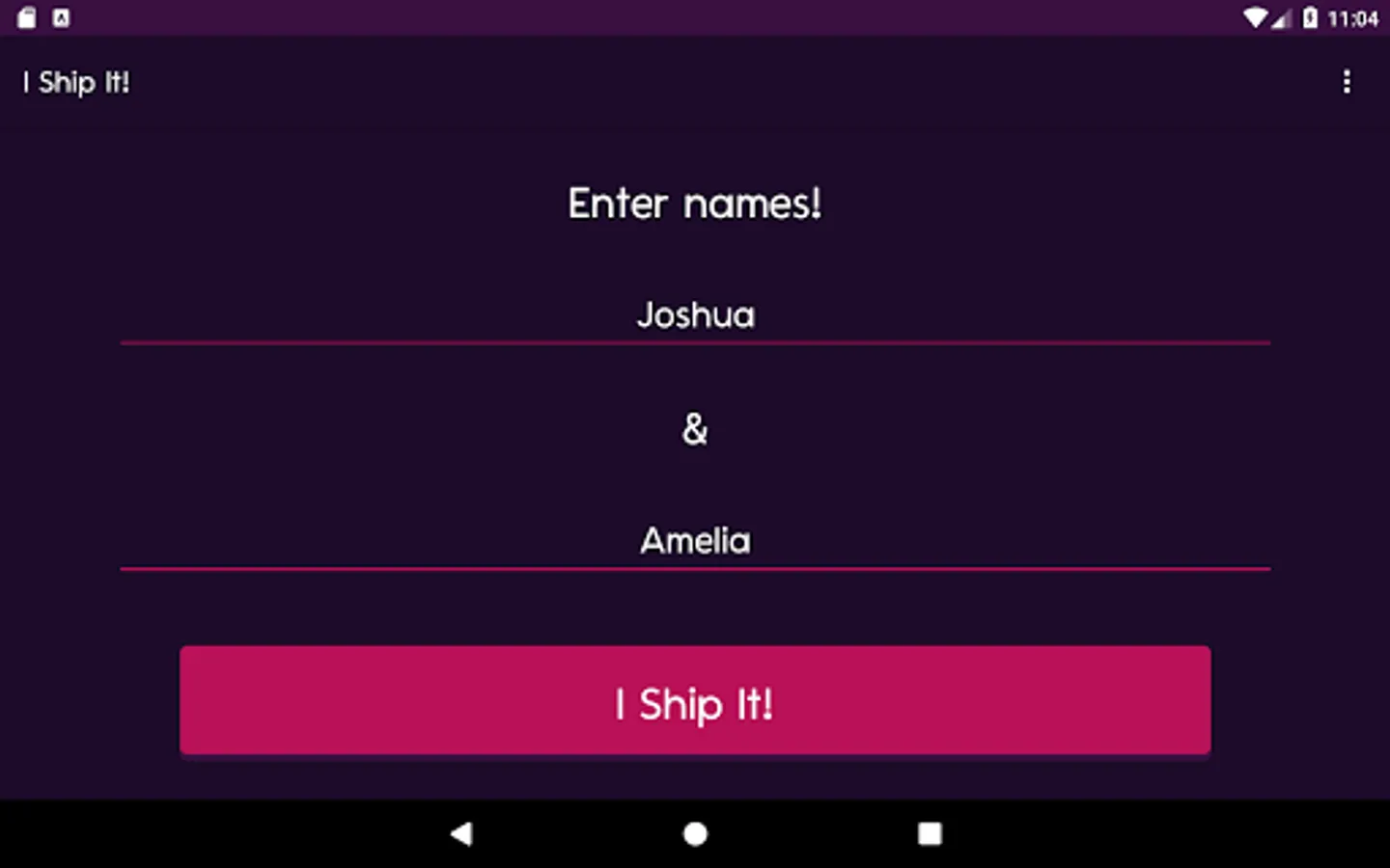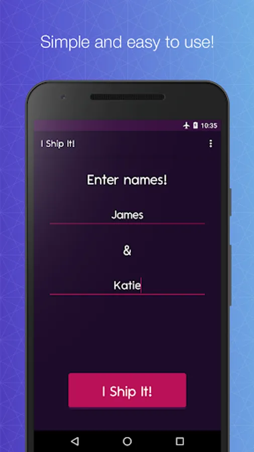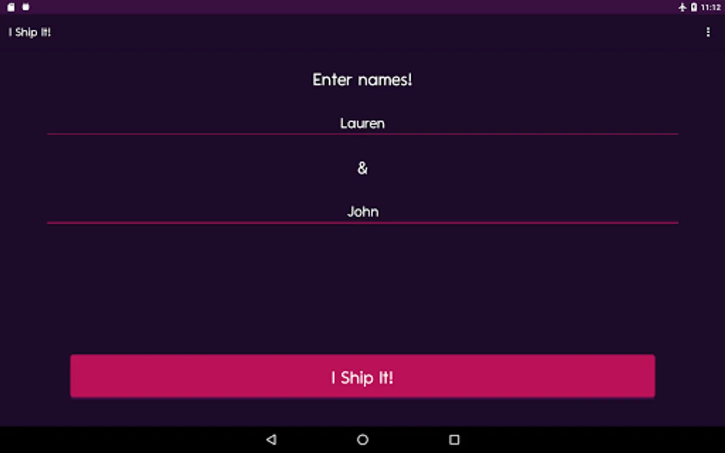 Need a name for your favourite couple? Maybe you need a name for a couple in your wattpad story? Worry not! "I Ship It" will generate a ton of ship names for your OTP (One True Pairing). Play with your boyfriend / girlfriend! Generate Ship Names for your friends!