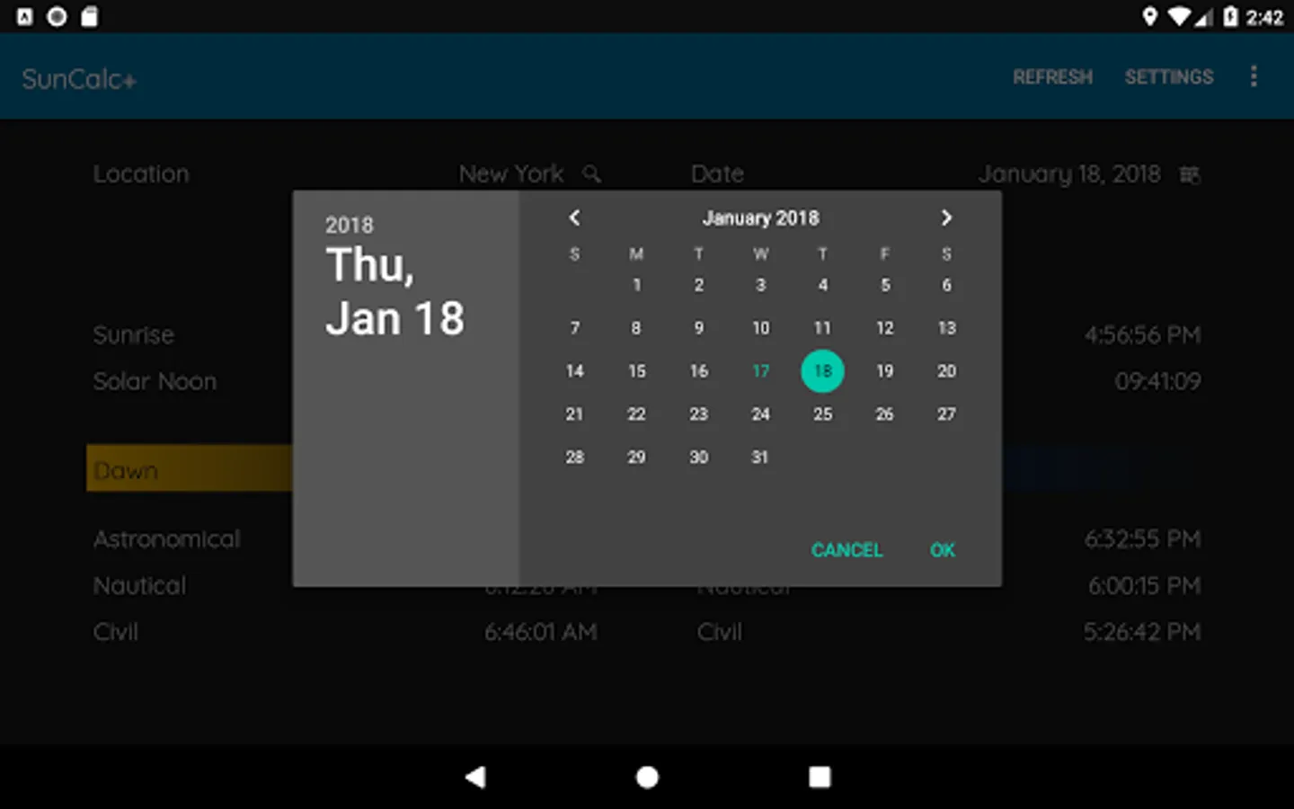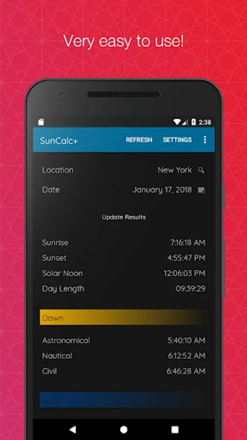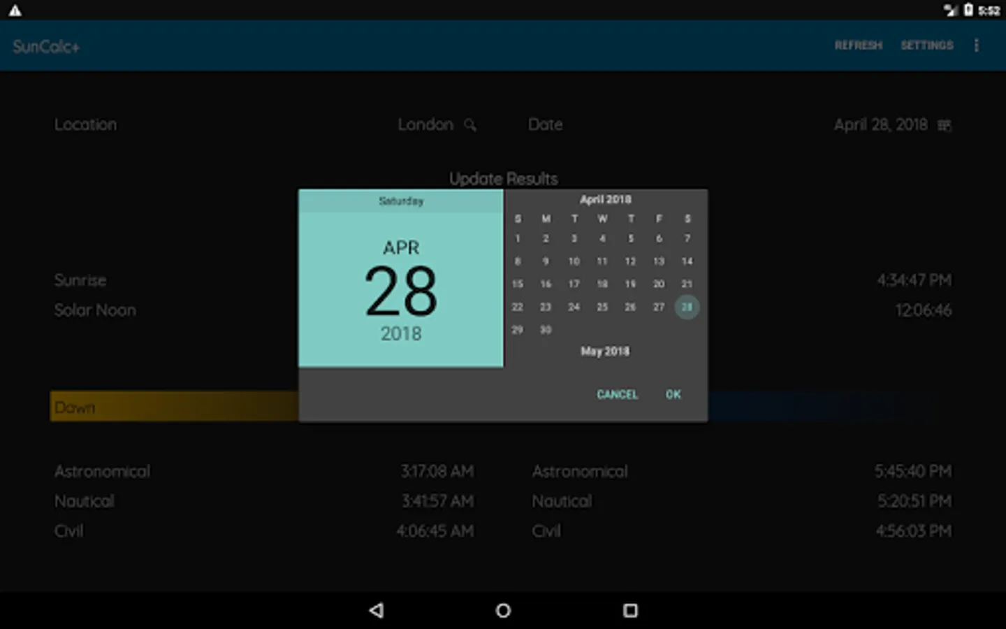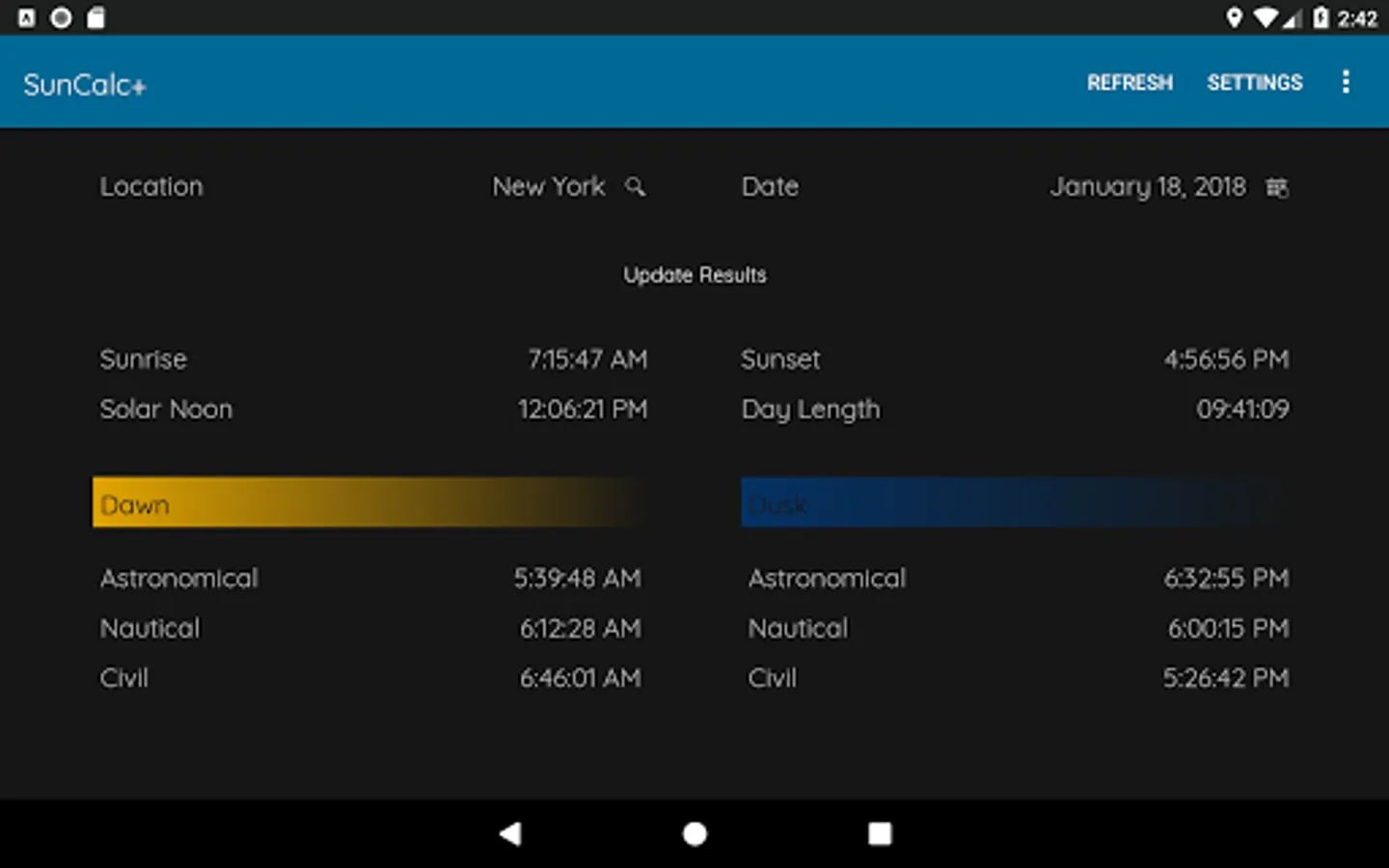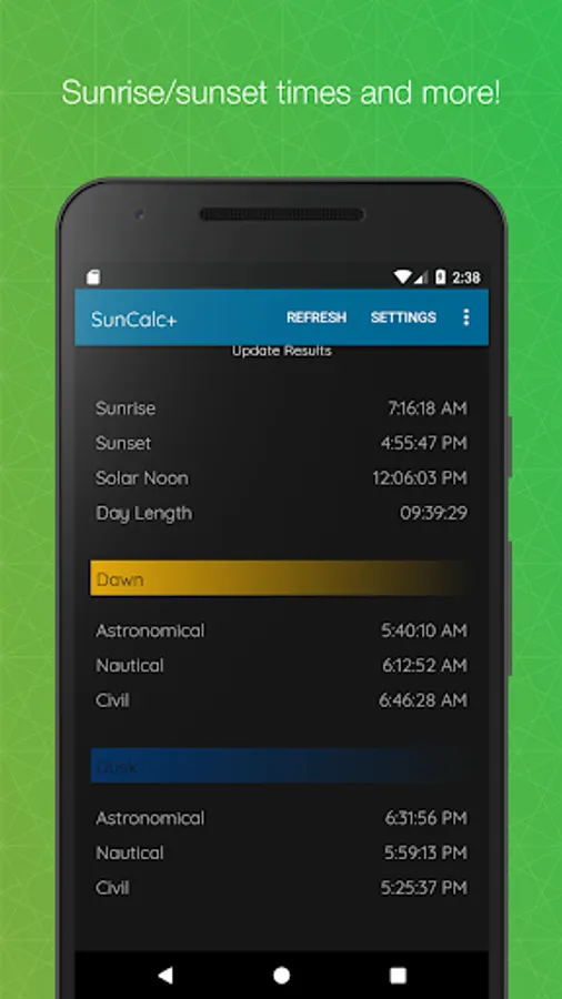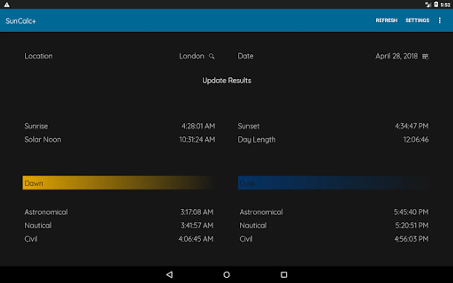 SunCalc+ is a simple app that will give not only sunrise and sunset times but also astronomical, nautical and civil twilight (dawn and dusk) times. You can choose a date and location. * SunCalc+ sunrise sunset dawn dusk twilight times * is completely free and very easy to use.