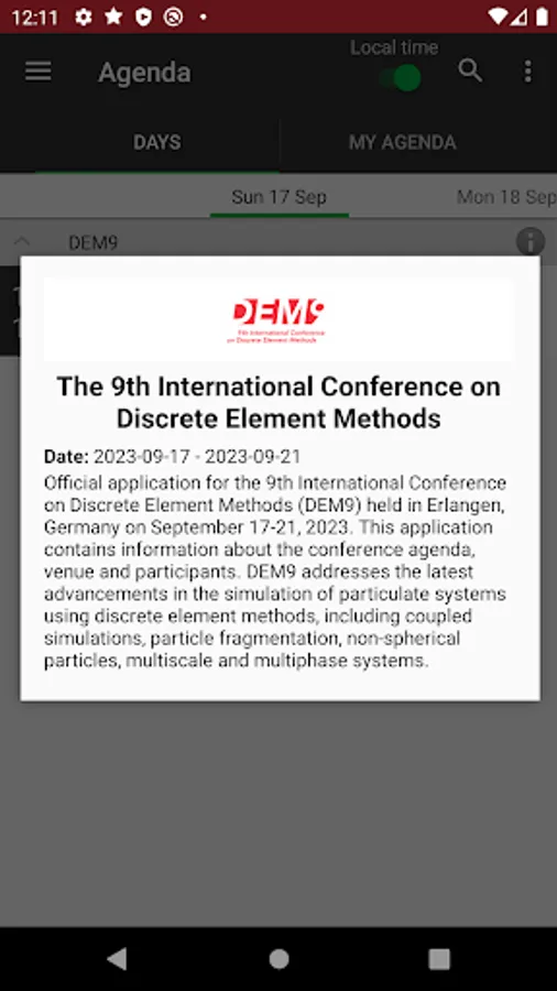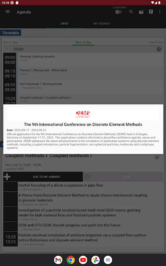 Official application for the 9th International Conference on Discrete Element Methods (DEM9) held in Erlangen, Germany on September 17-21, 2023. This application contains information about the conference agenda, venue and participants.