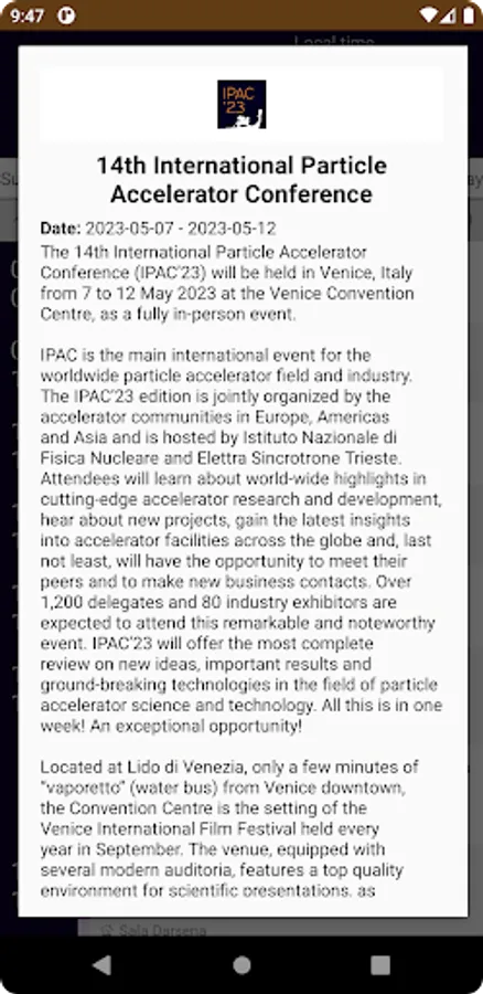 The IPAC23 app provides the most up-to-date information on the conference about the scientific programme; the industry sessions; the authors; logistic; exhibitors & sponsors.