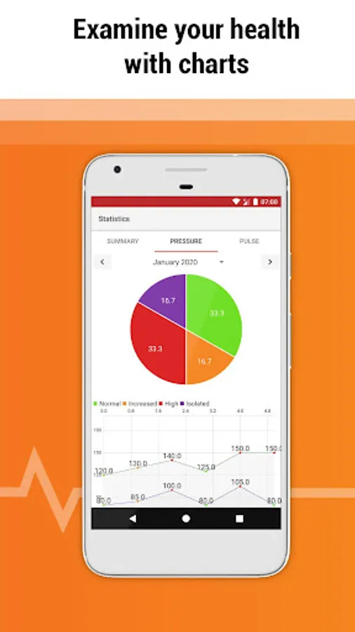 My Pressure allows you to view the statistical charts drawn on the base of measurements of any given time range. Line chart can clearly represent increase or decrease of blood pressure or pulse, while pie chart can give you insight to the correct and departing from the norm results proportions.
