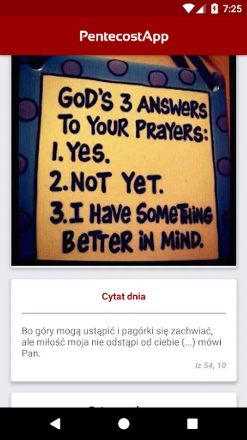 PentecostApp is an application designed and created with a view to Catholic groups preparing for Confirmation. It combines refreshed, inspiring content and a new way of communication. The content of the application consists of a religious meme, a quote from the Holy Bible and a brief history of the saint patron - all these elements are refreshed three times a week. In addition, the application includes specially selected for young people: prayer and examination of conscience. Parishes that set up their account in the PentecostApp system will also be able to use the communication channel in the application. Confirmed after registering as a student in a given parish group, he receives messages sent from the level of the web system by the priest and animators who are preparing for Confirmation. Messages come as a notification on the phone, and their senders have a preview of who the recipient read the message.