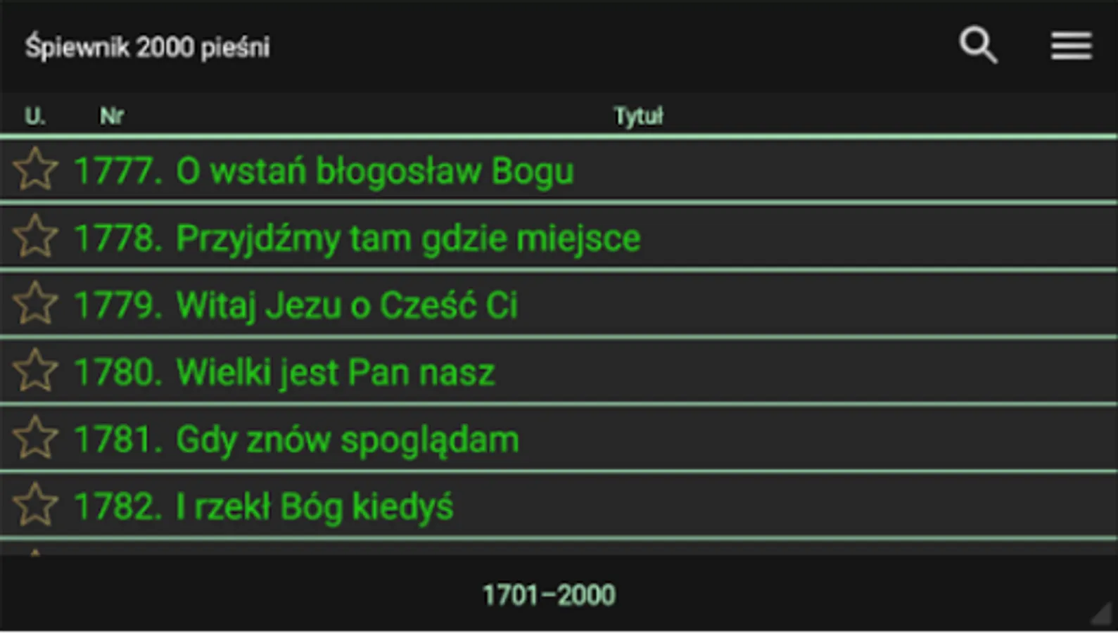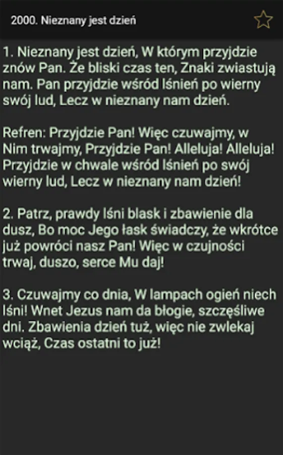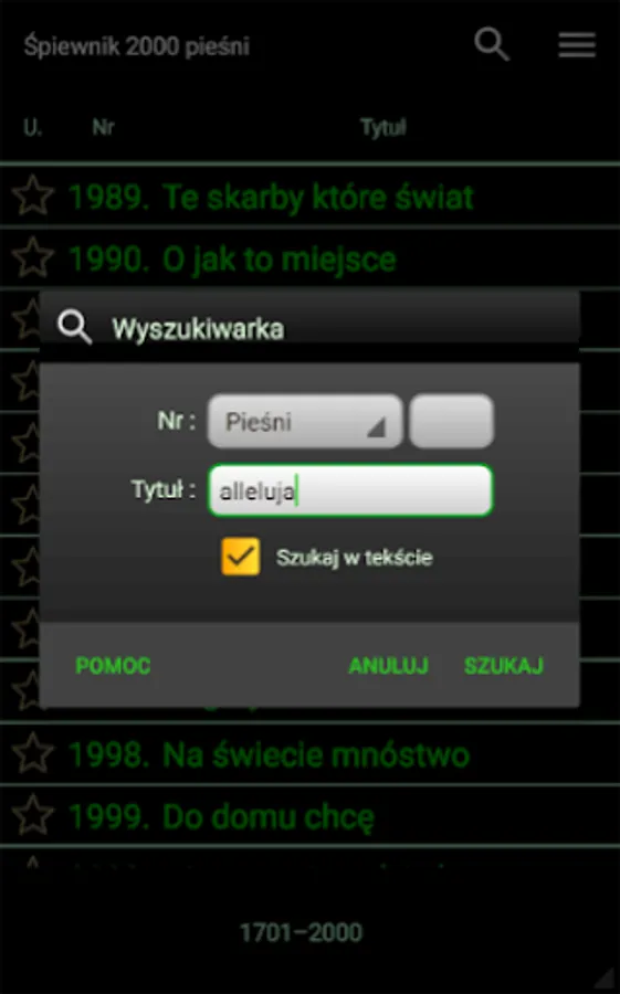 The application allows you to quickly search by number, title and song text. There is also an option to create a list of favorite songs.