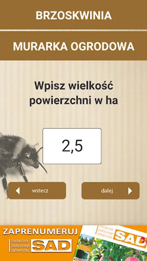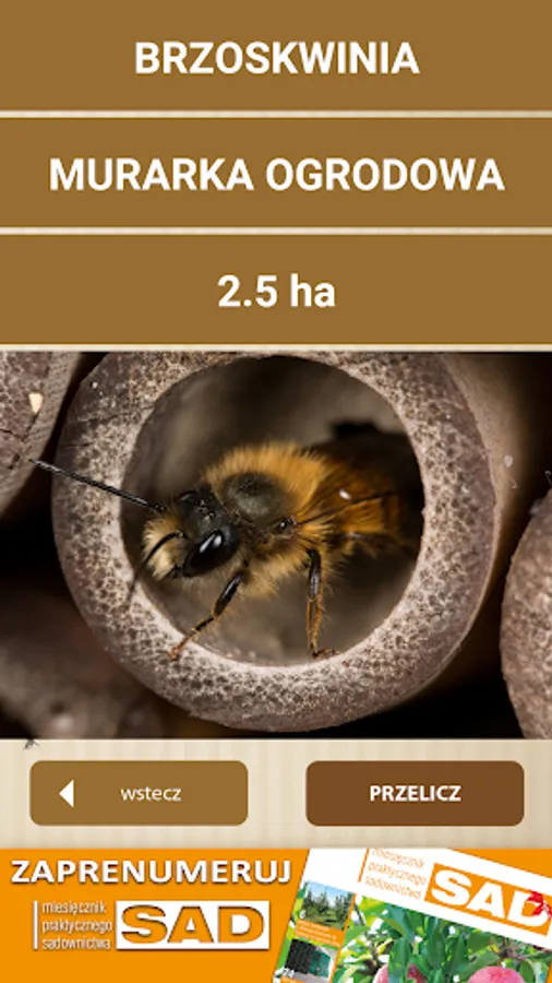 The application helps the fruit farmers to calculate the number of hives of bees or bumblebees or how many cocoons masonry garden is needed for proper pollination of fruit crops. It takes into account the 13 species of fruit (gooseberry, blueberry, peach, cherry, pear, apple, raspberry, apricot, black currant, red currant, plum, strawberry, cherry). The calculator calculates the result for any area of the plantation and orchard.