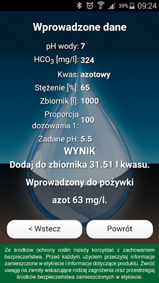 A tool to facilitate the calculation of the application of acid to change the pH of the medium used in the cultivation of the irrigation system. It allows you to select the correct dose of nitric acid or phosphoric acid in the medium tanks in systems with proportional dispenser. Associated provides information about the amount of introduced acid element (P or N) to the ground.