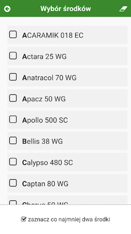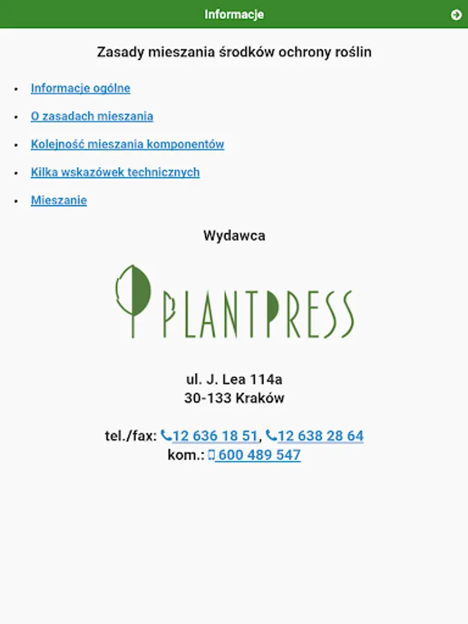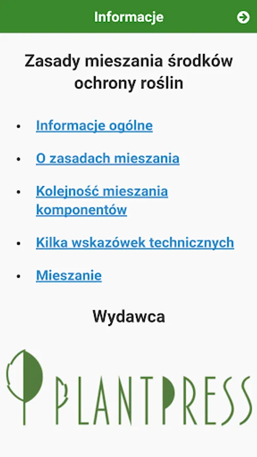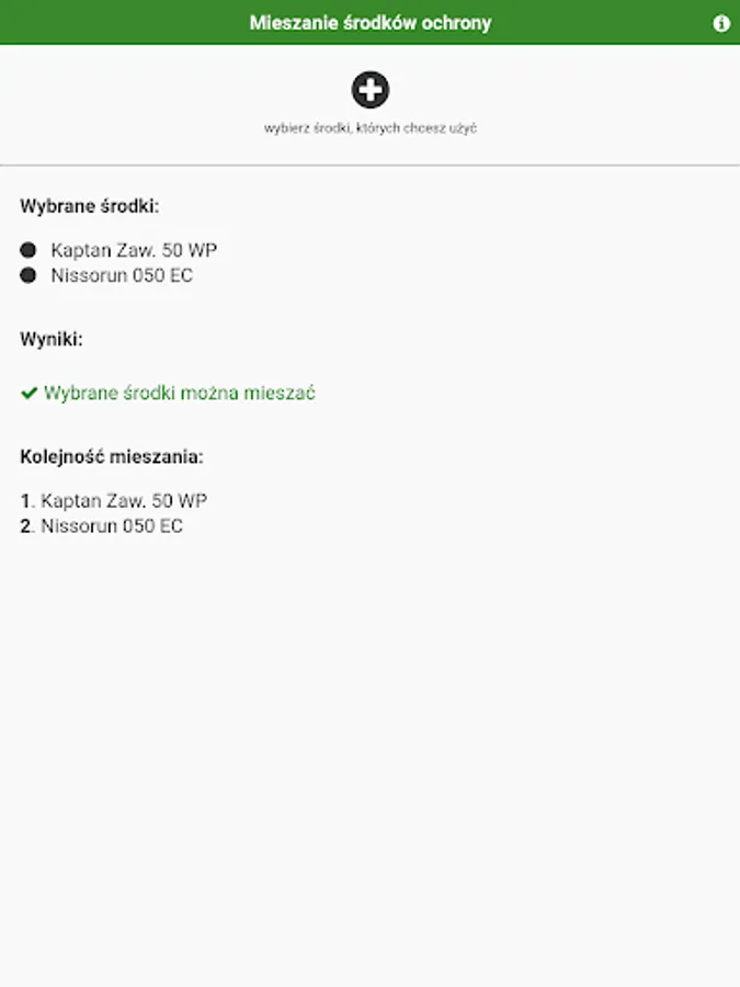 The application allows for quick and convenient check whether any plant protection products can be mixed with each other. It does not require the user to verify the data in the so-called. a hash table. It also contains a number of other tips needed to prepare a safe mixture of plant protection products.