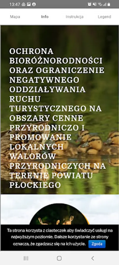 The application presents the most important information regarding the most important information and news regarding the Eco-initiative in the Płock district. Protection of biodiversity and limiting the negative impact of tourism on environmentally valuable areas and promoting local natural values in the Płock District.