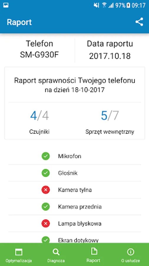 Check the status of your smartphone with the application diagnostic SmartSkaner +. Plus, being a client and having taken out a service application, you can make free and available at any time diagnostics of your device. In the application, you will find detailed information on the status display, microphone, camera, flash, speaker, and many other features of your smartphone devices and instructions for reporting to repair in case of damage.