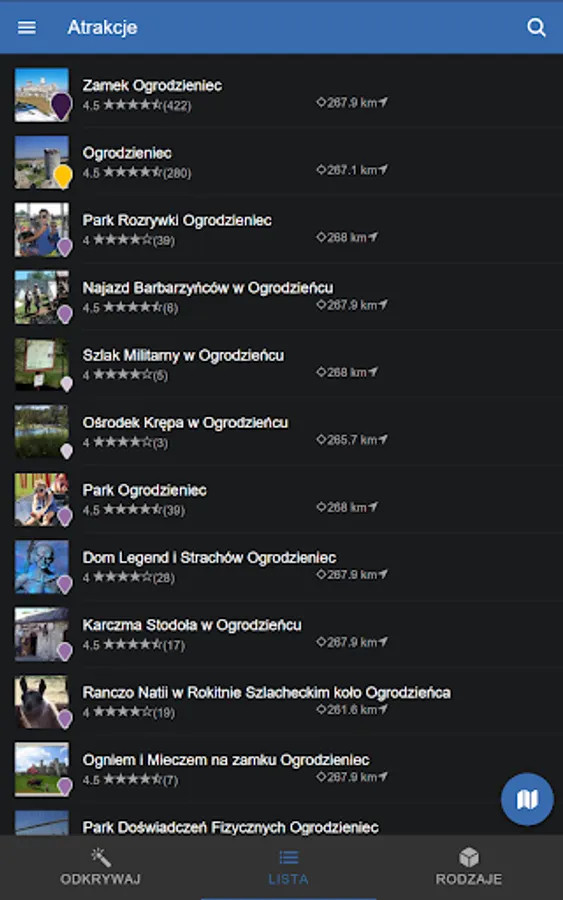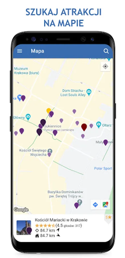 Thanks to the precise marking on the map, the distance and direction from your GPS location are displayed next to each attraction, and if you select your home - also from it.