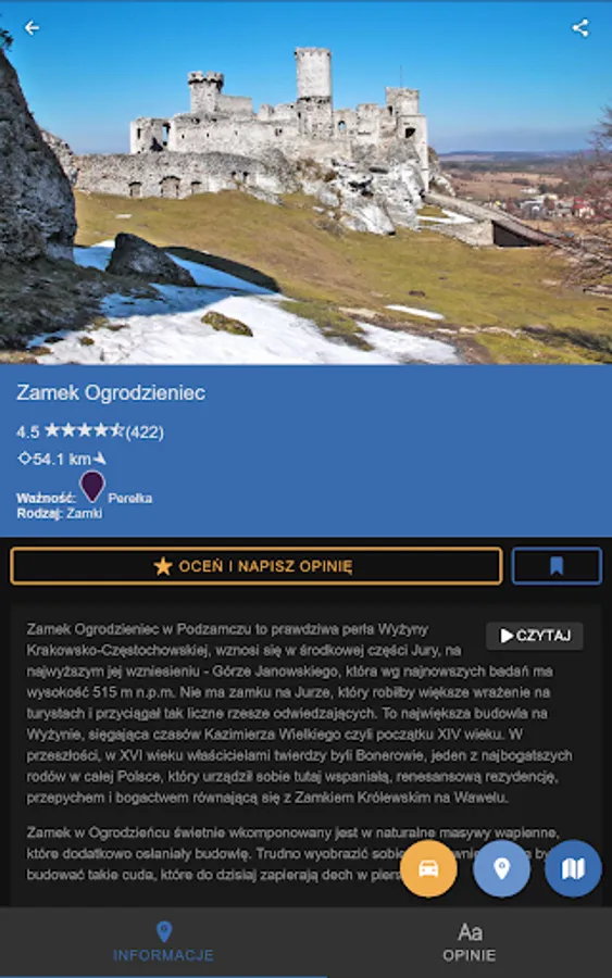 All our attractions are exactly marked on the map . By freely navigating it, the application will automatically top up places within a given view, where the size and color of the pin determines the importance of the attraction, so you immediately know where you should direct your eyes. When describing attractions and on the map, there are useful buttons that will turn on your favorite navigation (eg AutoMapa, Google Maps or Waze) - just get in the car and drive. All filters are also available on the map to narrow down your search to those relevant to you.