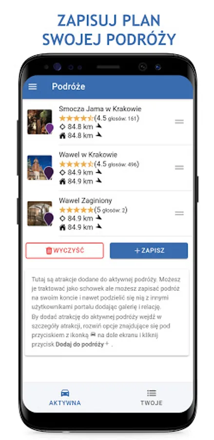 Our app is also an excellent trip planner . By browsing the descriptions of attractions, you can add each to the current itinerary, then save it and play it back during the tour. You can show off your saved trips to others by adding a photo gallery and a report to them - but this is already on our portal https://www.polskieszlaki.pl, with which the application is closely related.