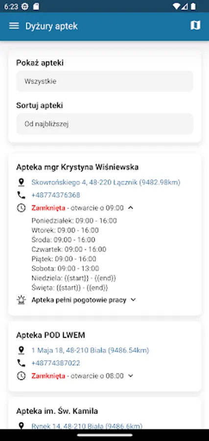 The application allows you to check the opening hours and duty hours of pharmacies in the district, thanks to which you will always have access to current information. The pharmacy duty module allows you to filter, sort and locate pharmacies depending on your needs. A clear map shows the location of each pharmacy, and also allows you to determine the route to the facility of your choice.