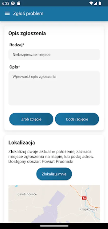 The application allows you to report various problems or faults in a very simple way. It can be, for example, a dangerous place, damage to a poviat road, destruction of a natural object or lack of pharmacies on duty. Select the report category, take a photo, press the locate button and submit the report.