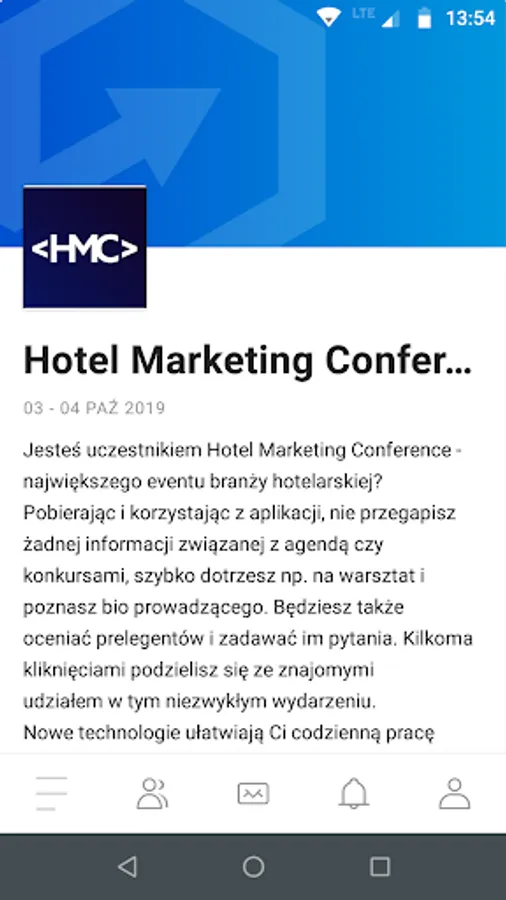 Are you a participant in the Hotel Marketing Conference - the largest hotel industry event? By downloading and using the application, you will not miss any information related to the agenda or contests, you will quickly reach eg a workshop and you will get to know the bio-leader. You will also evaluate the speakers and ask them questions. With a few clicks you will share with your friends participation in this amazing event.