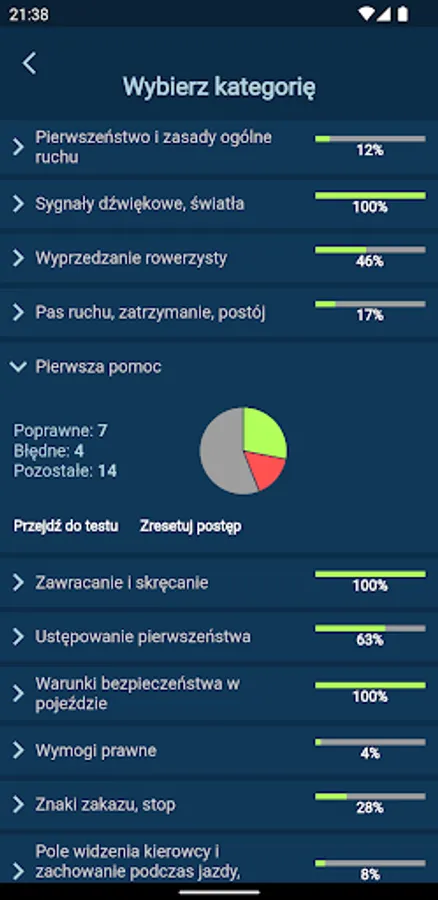 A fully FREE application with the entire database of 2022 driving license exam questions. The ability to control your progress on charts and the ability to learn are one of its many advantages.