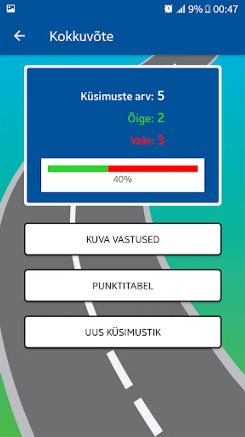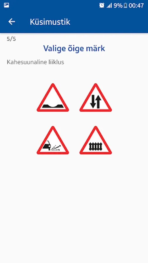 This application will remind road signs information. It controls your knowledge through questions categories, based on the numbers and types (questionnaire must bring together the observations and description, or vice versa).