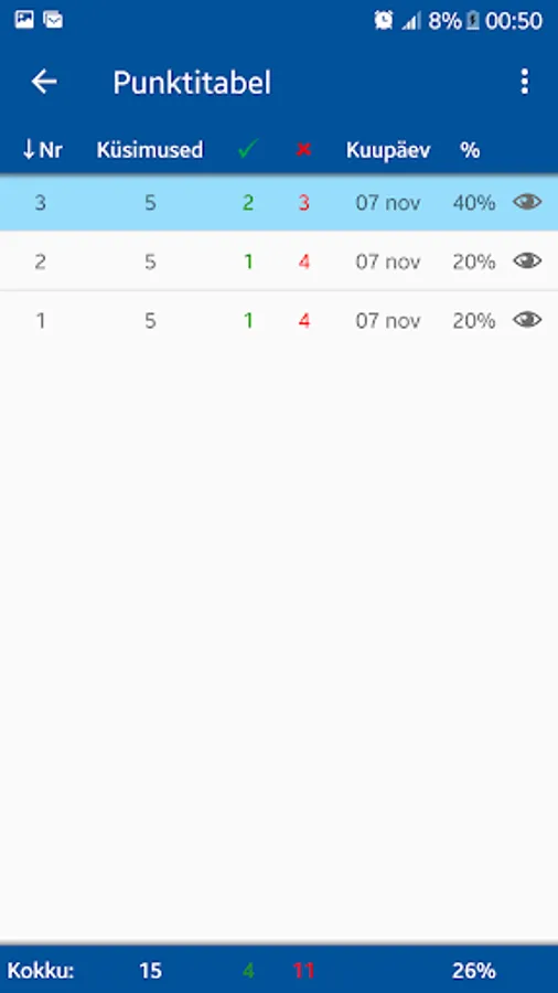 The survey results are stored in the table, where you can check your achievements, and view the results on the questionnaires. Questions you answered incorrectly are saved, so you can easily review them and repeat.
