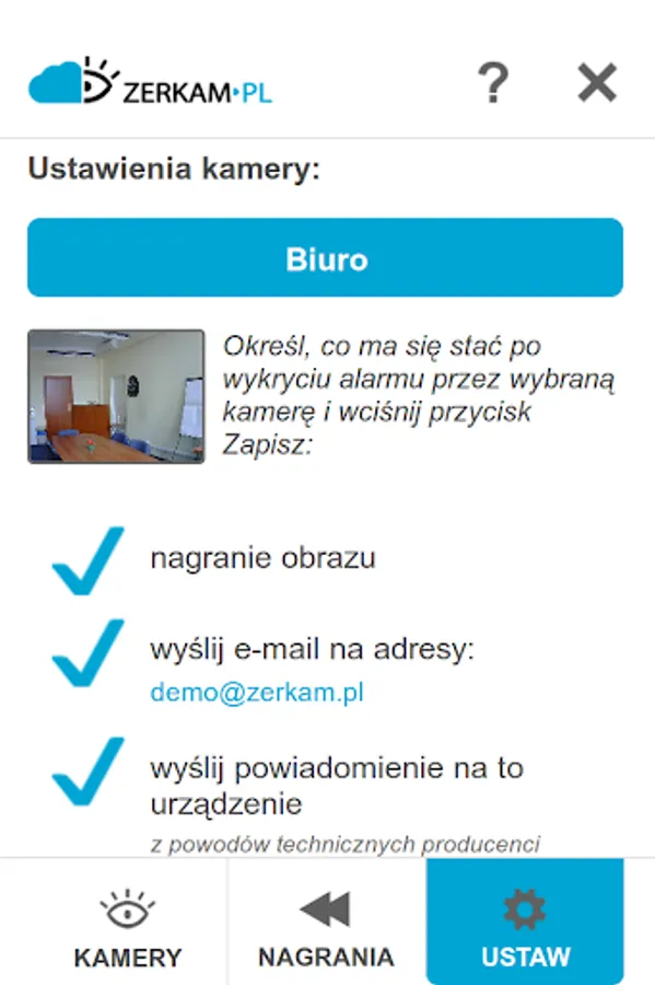 - Notification of alarm events (by e-mail or as notifications in the application).