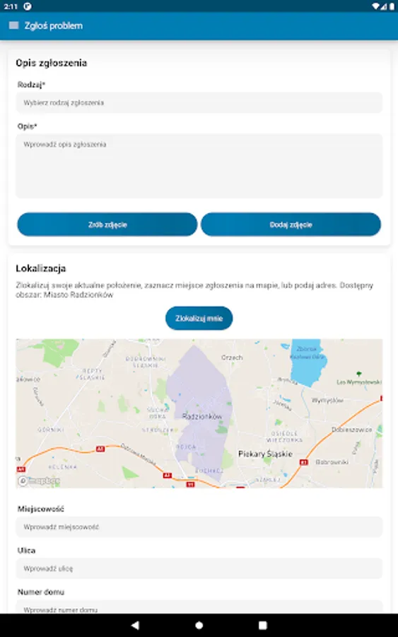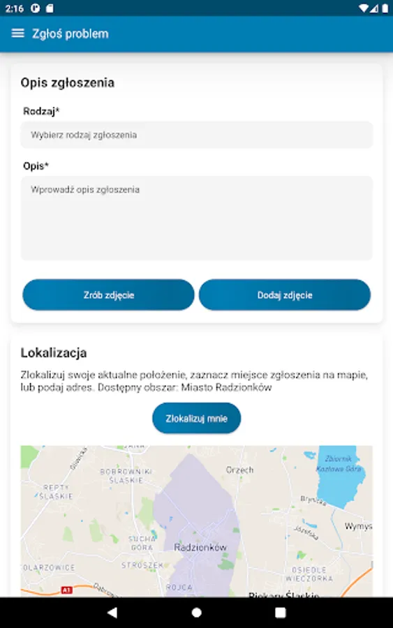 It can be, for example, a dangerous place, street lighting failure, a problem with waste disposal or an illegal garbage dump. Select the report category, take a photo, press the locate button and submit the report.