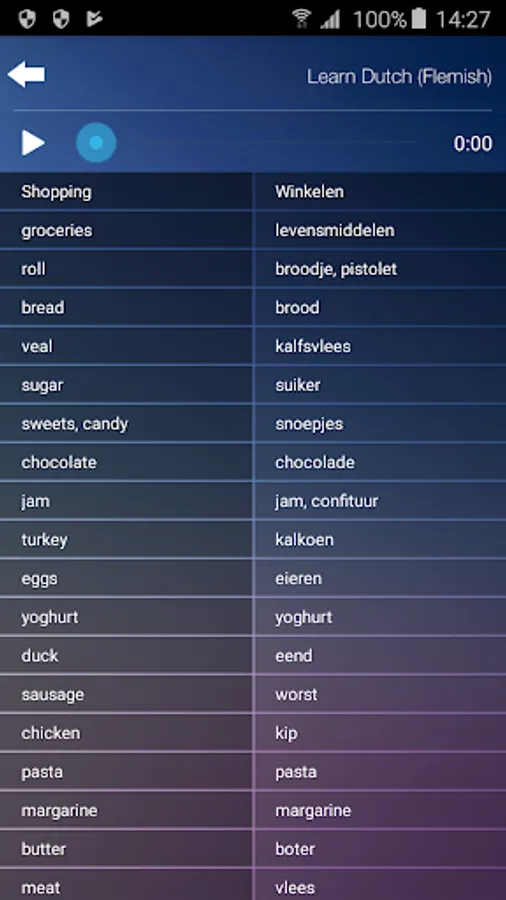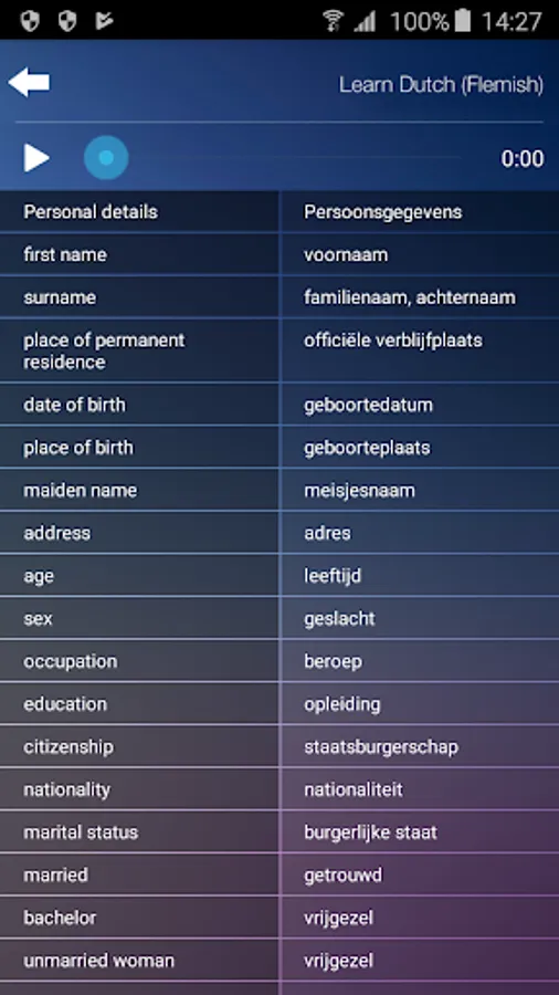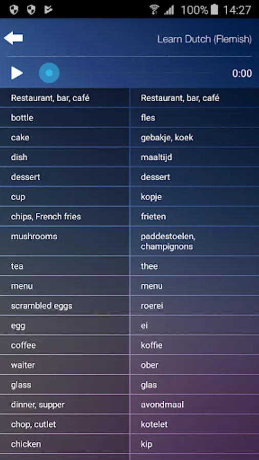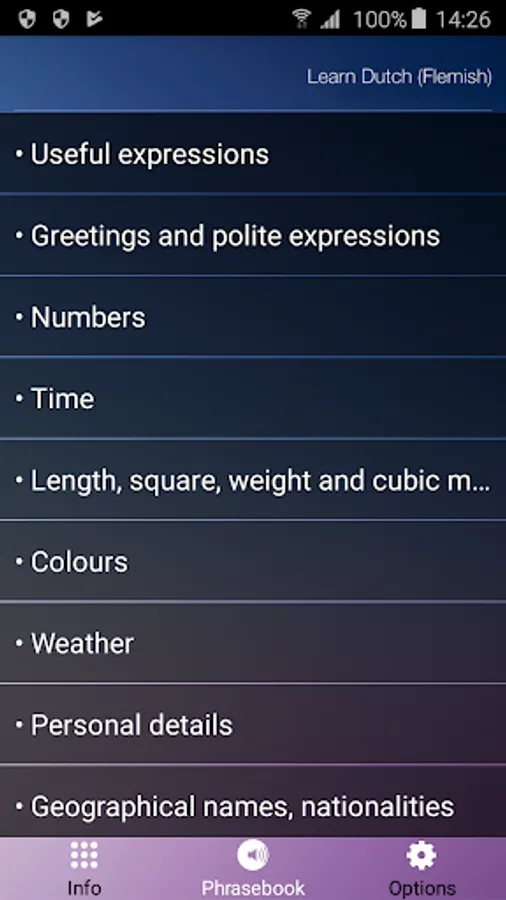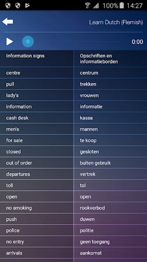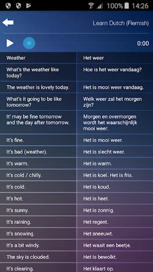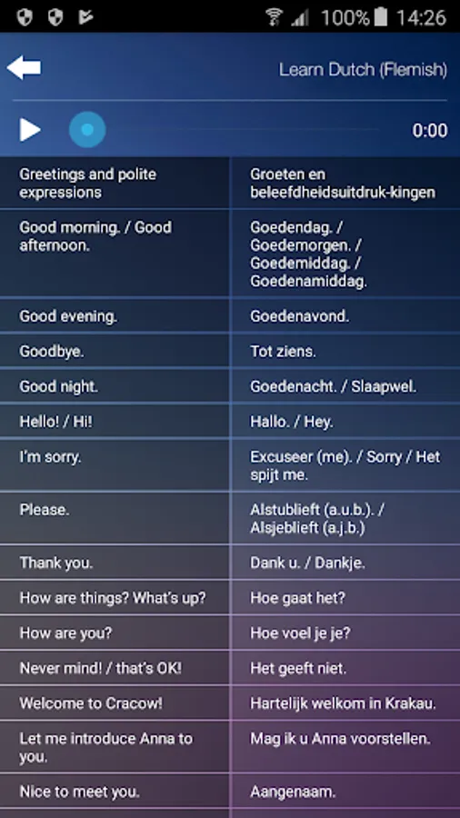The most essential words and phrases of the Flemish language, each with native speaker audio. Perfect travel app! All audio is downloaded to the device and accessible even in airplane mode or without expensive international roaming fees.