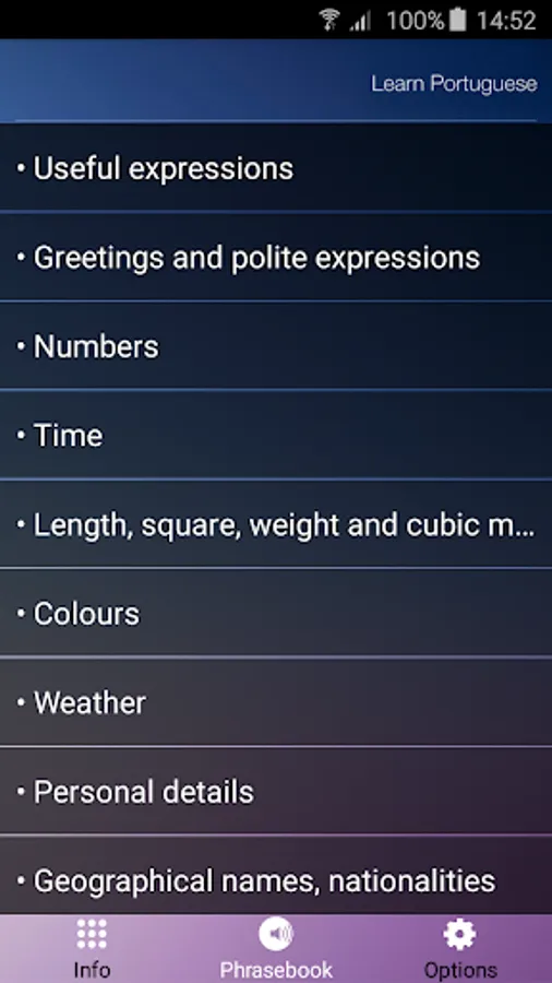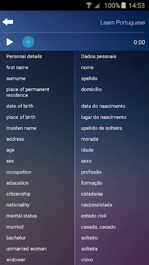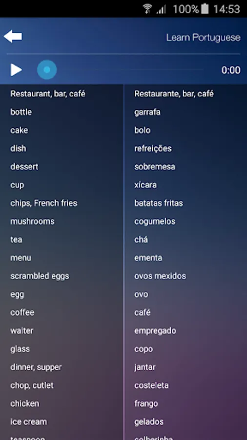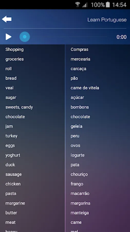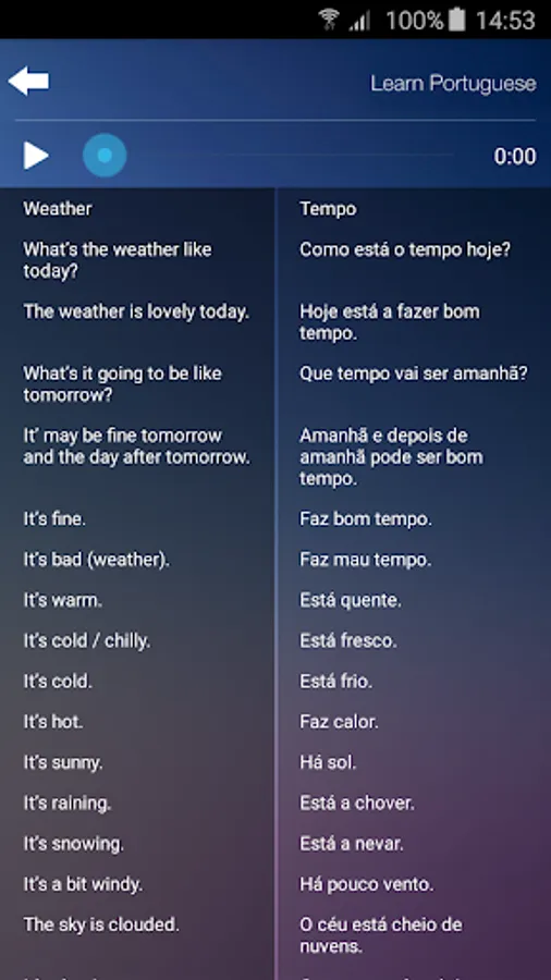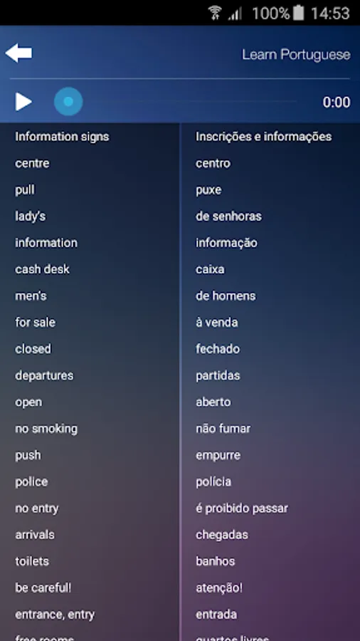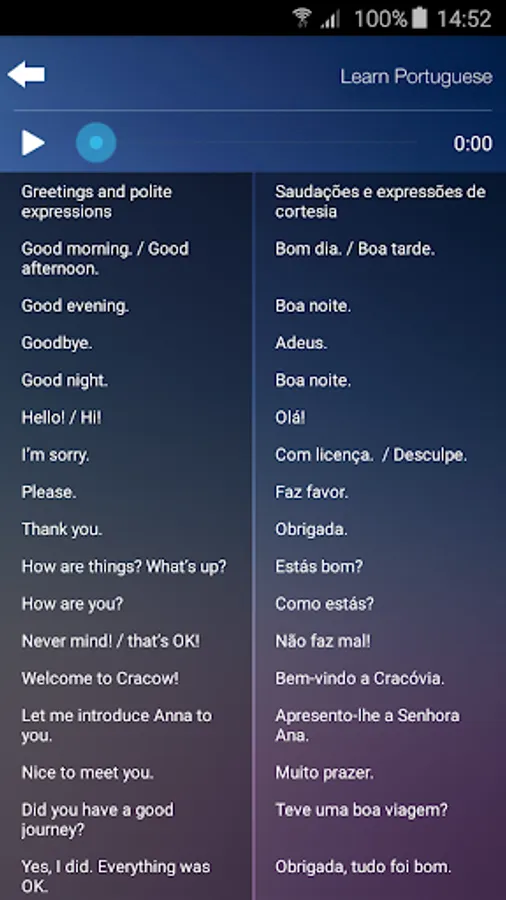 The most essential words and phrases of the Portuguese language, each with native speaker audio. Perfect travel app! All audio is downloaded to the device and accessible even in airplane mode or without expensive international roaming fees.
