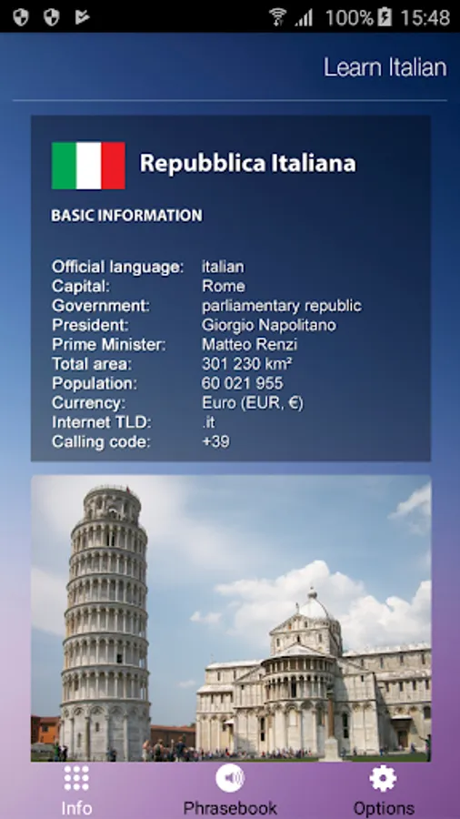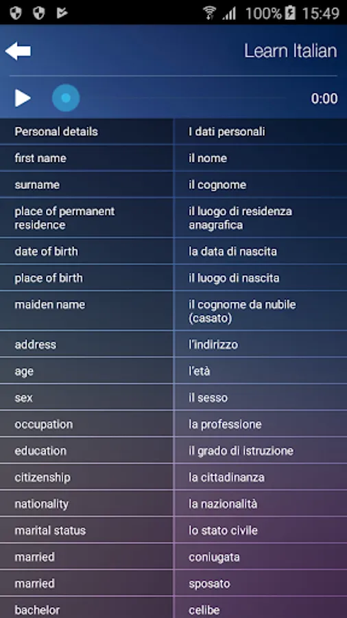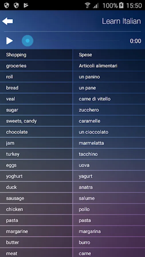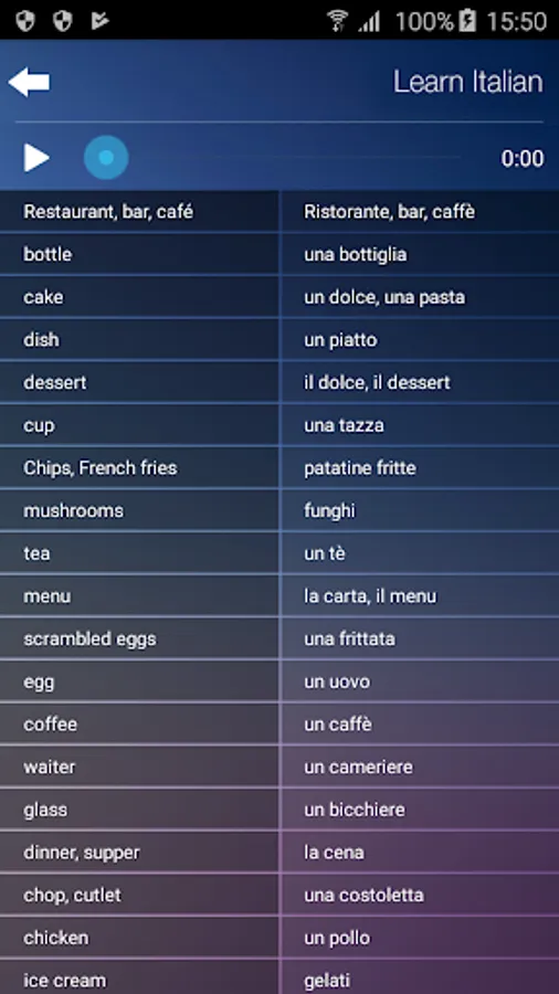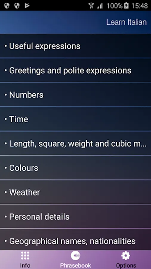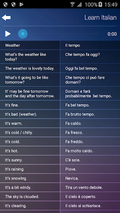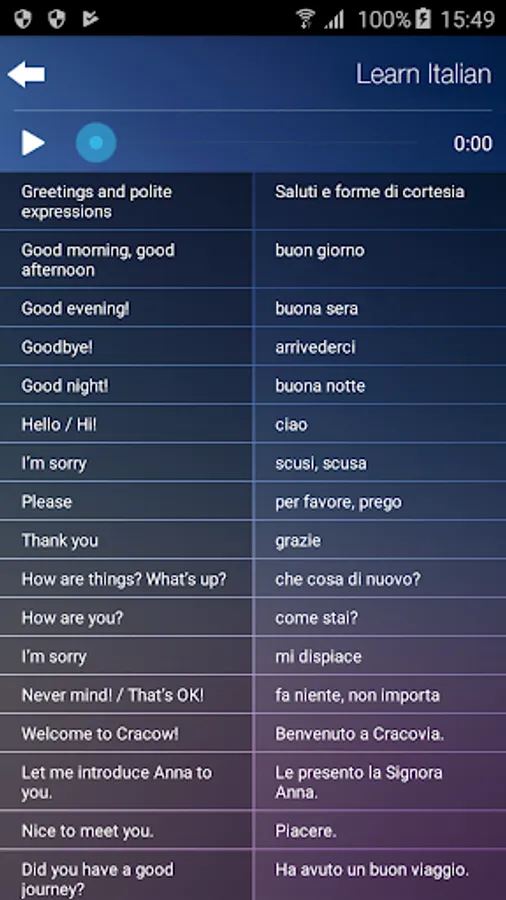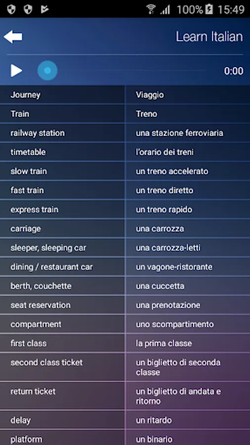 The most essential words and phrases of the Italian language, each with native speaker audio. Perfect travel app! All audio is downloaded to the device and accessible even in airplane mode or without expensive international roaming fees.