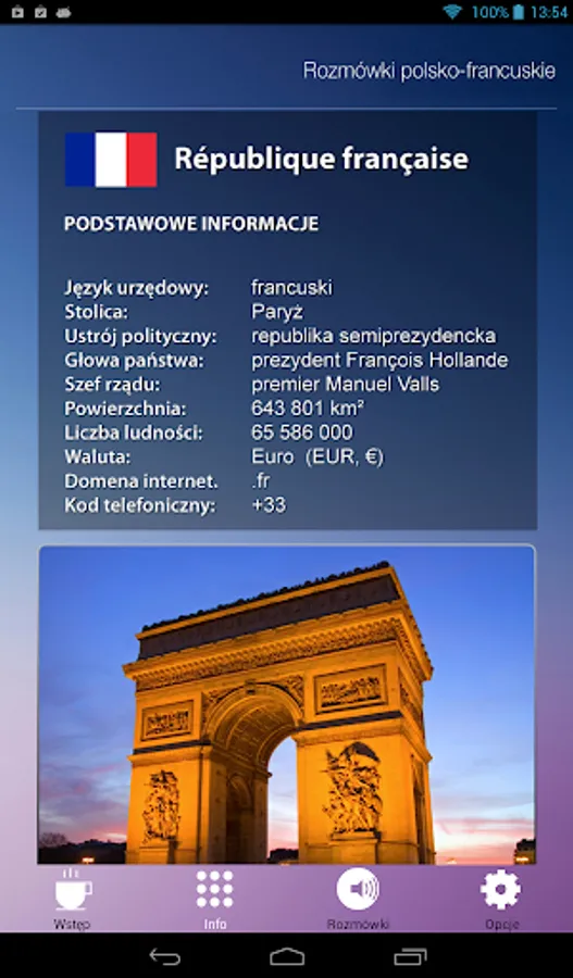 Dodatkowo aplikacja zawiera podstawowe informacje o Francji.