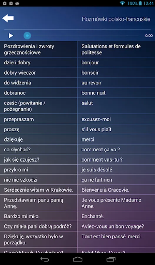 Rozmówki polsko-francuskie to aplikacja umożliwiająca rozpoczęcie nauki języka osobom, które nigdy wcześniej nie miały styczności z językiem francuskim, jednakże są one również doskonałą aplikacją, która ugruntuje i poszerzy znajomość języka u osób mających już podstawy francuskiego.