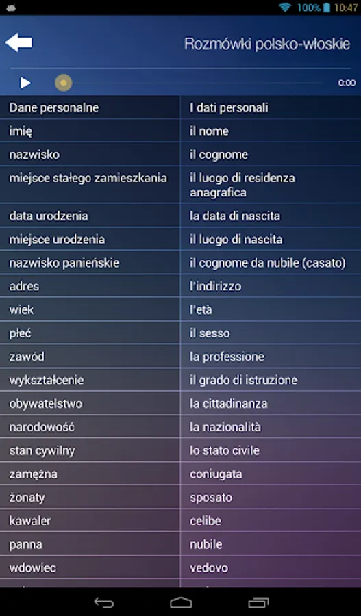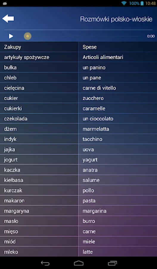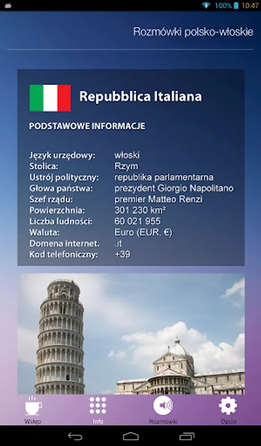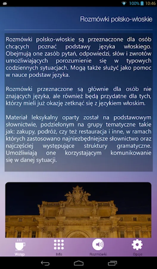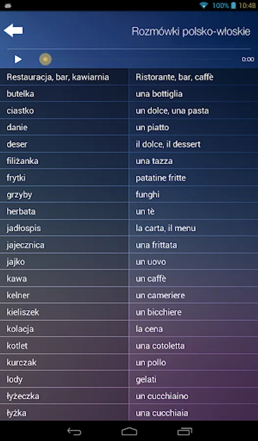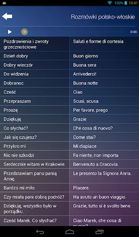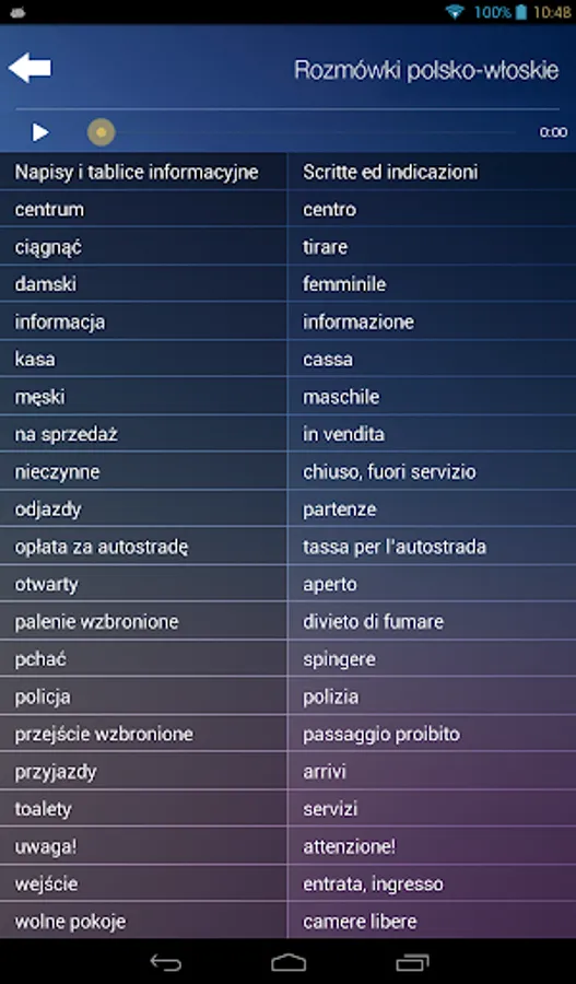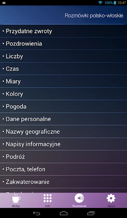 Polish-Italian phrasebook is an application intended for people who want to learn the basics of the Italian language. It includes a set of questions, answers, words and phrases enabling communication in typical everyday situations.