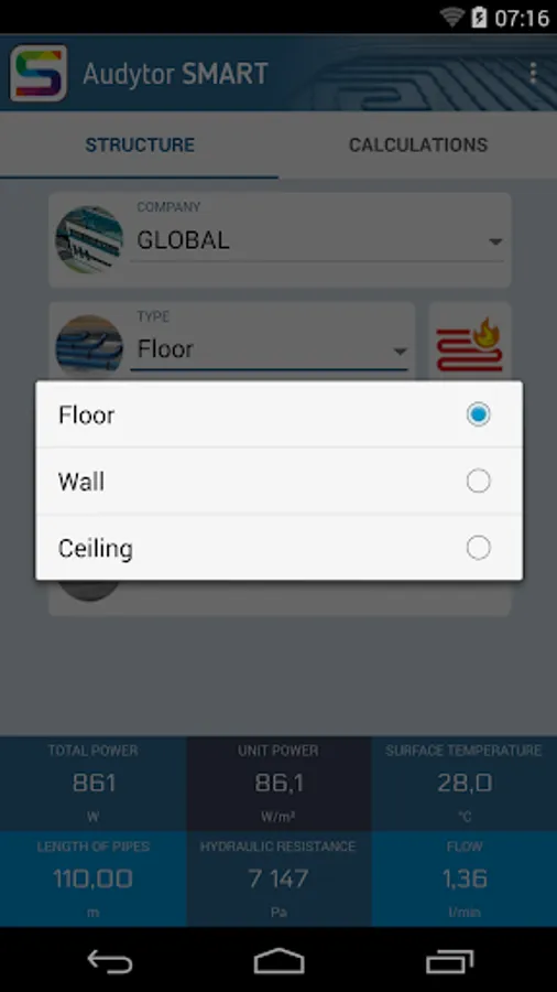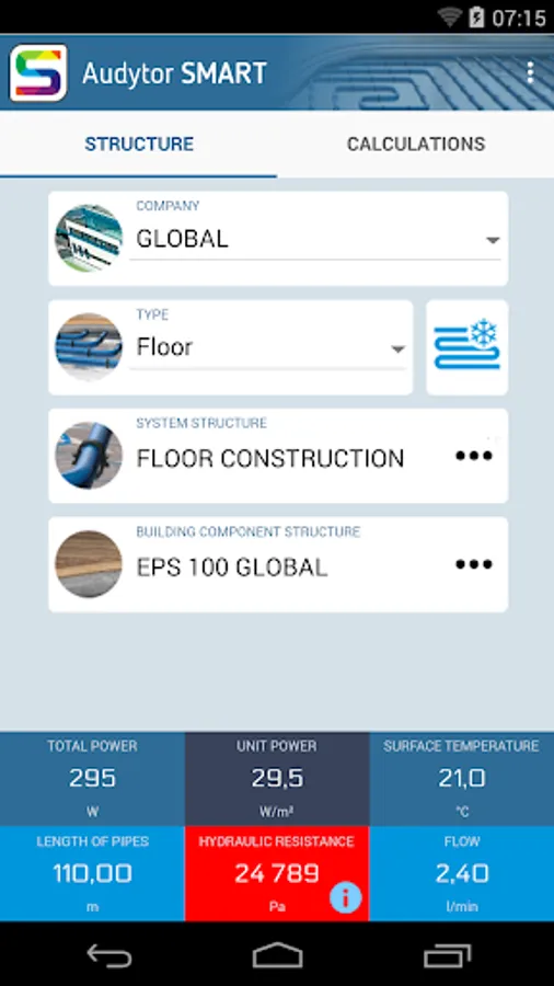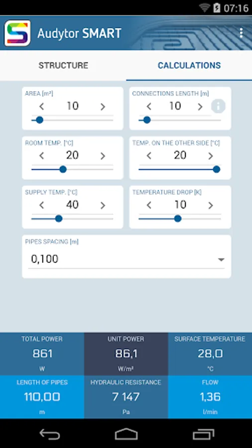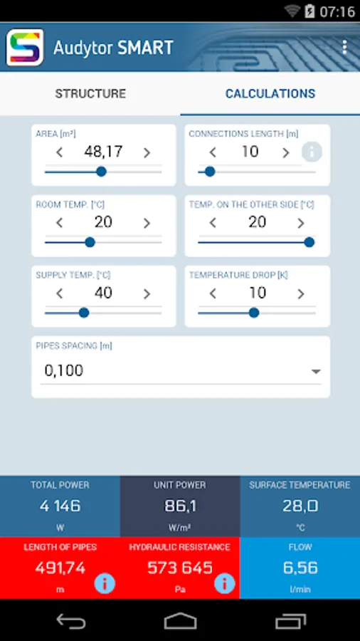 Audytor SMART is an app for a quick calculation of heating and cooling output of floors, walls and ceilings with internal pipes used to convey heating or cooling water.