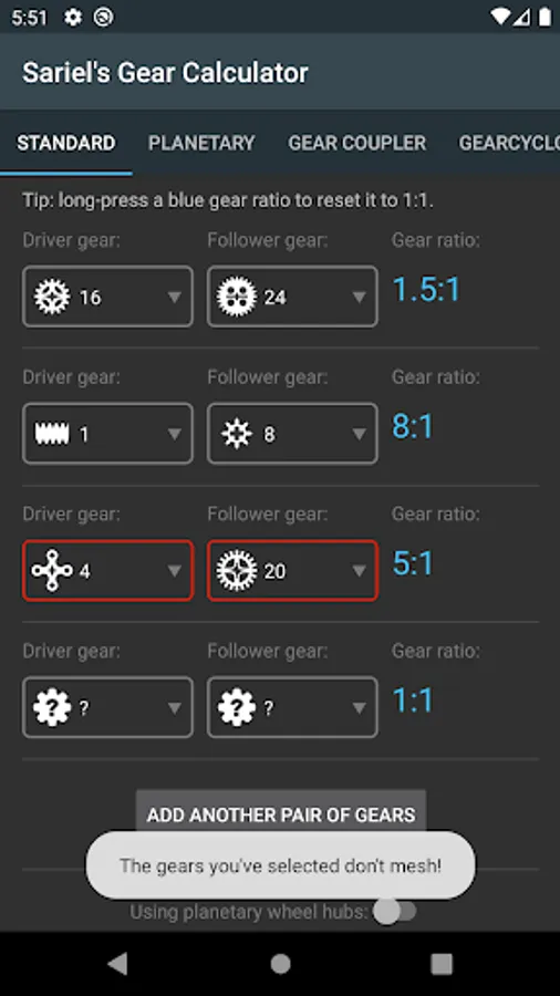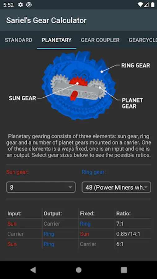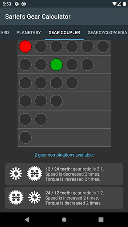 This tool is aimed at all AFOLs. Use it to calculate final ratio of up to 10 pairs of gears, then select the desired type and number of motors to see the theoretical output (speed and torque). Includes 15 sizes of gear wheels and 26 various types of motors! Also included: a planetary ratio calculator, gear coupler for finding available gear combinations at given axle spacing and Gearcyclopaedia featuring detailed info on 38 types of gears. NEW: Combinations finder tab where you can enter a desired gear ratio and the numbers of pairs of gears you want to use, and the app will calculate the solution (exact or the closest possible).