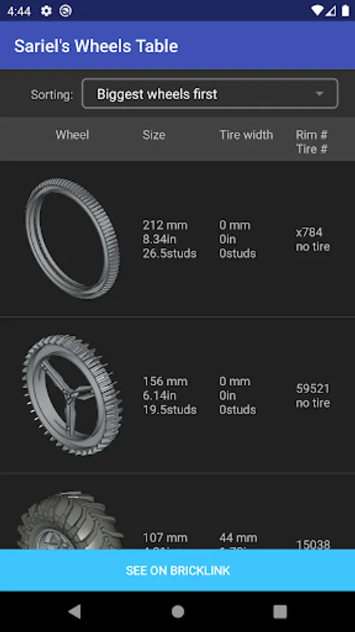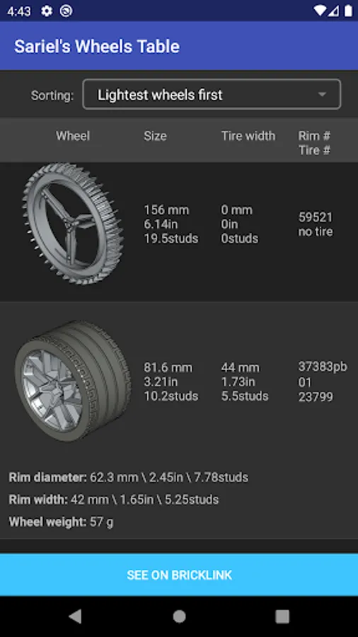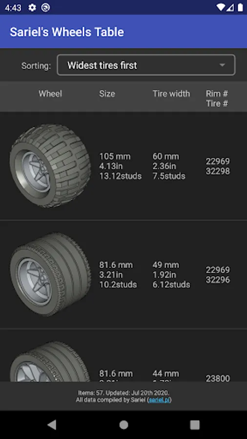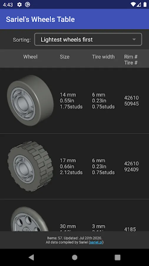 Sariel's Wheels Table comes to your aid when picking wheels for your build. Browse 60+ wheels with all their dimensions, weight, part numbers and even their Bricklink links! Also includes quality image of each wheel for easy identification and option to sort the list by a desired parameter.
