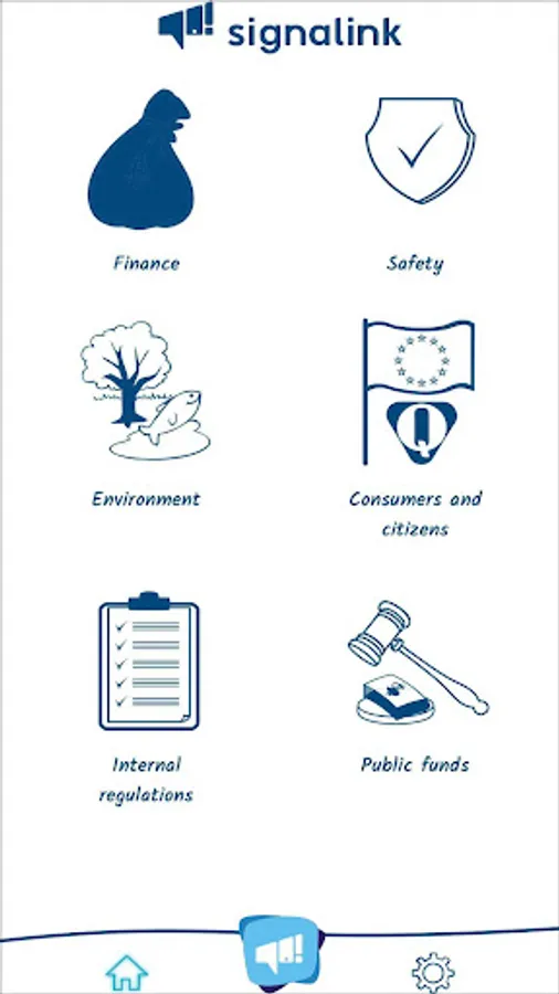 This mobile app is a part of the Signalink system provided to companies by the RESQL company. Registration code is spread inside the companies which bought licenses for the system. App allows to report law violations in anonymous way and be informed about taken actions.