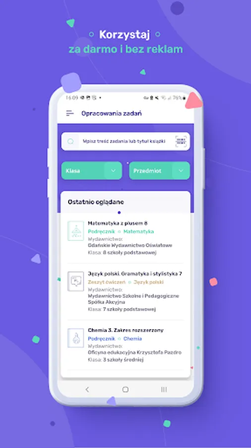 Skul.pl is a free mobile application where you will find teacher-tested solutions to tasks from textbooks, workbooks and sets of tasks for grades 4-8 of primary school and 1-4 of secondary school (high school, technical school). For each task you will find the exact solution and the teacher's explanation of how to solve it.