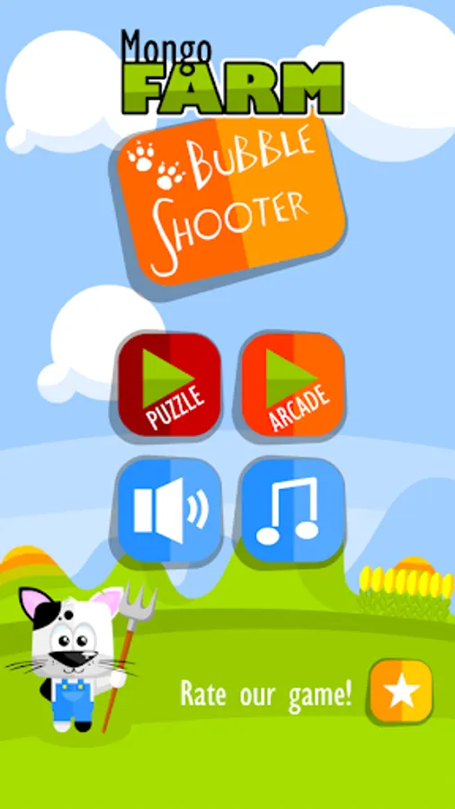 The game takes place on the Mongo's farm. Tap, where you want Mongo to shoot the bubble. Group bubbles at least in threes to make bubbles disappear from the farm. Tap the farm cannon to swap bubbles (the current bubble with next bubble). Help Mongo cat to clear all the bubbles on the screen!