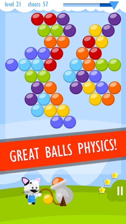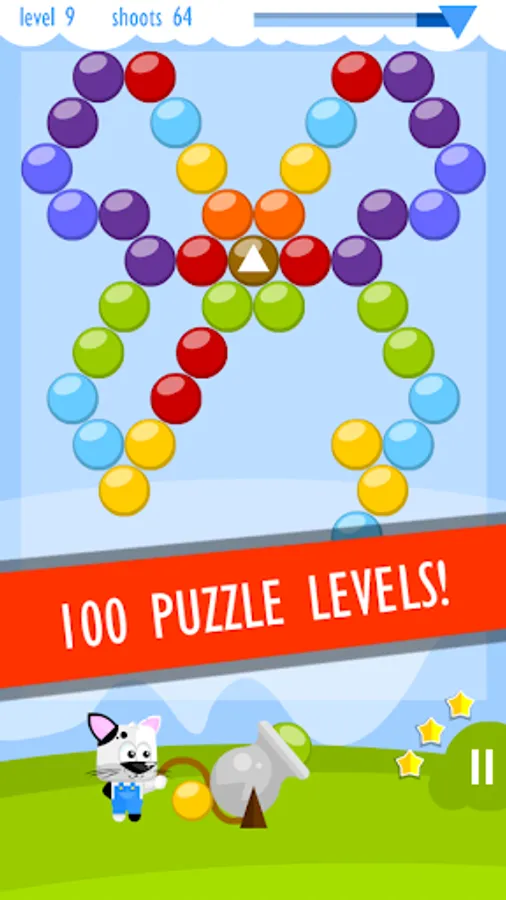 The game is the hybrid of classic bubble shooter and puzzle bubble shooter with 100 different, unique levels. Mongo cat will take you for long and fantastic journey of bubble shooting on his farm!
