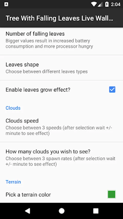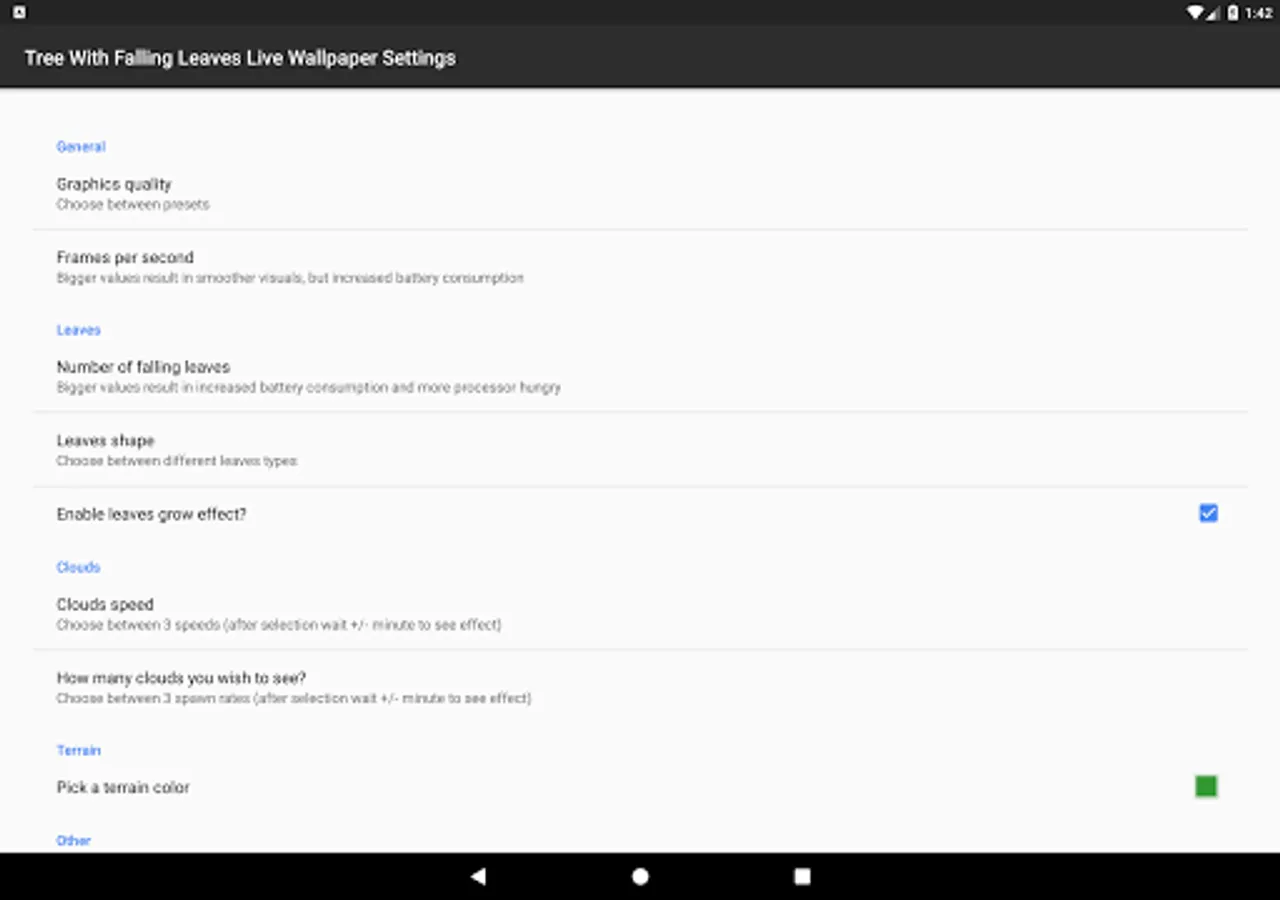 After installation just find Tree With Falling Leaves Live Wallpaper in your apps => run it => on preview screen press settings button => modify preferences as you like. Alternatively you can set Tree With Falling Leaves Live Wallpaper like every other live wallpaper before (e.g. from your home screen).