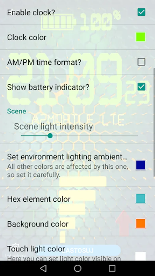 ☆ You can freely change WallNot style by selecting one of ready settings presets or set you own preferences (change element color, background color, environment lighting color, scene light intensity, touch light color, clock/battery/network color etc.)