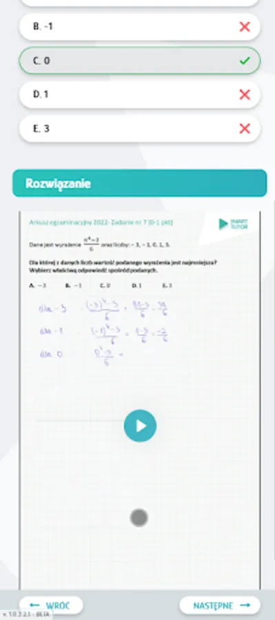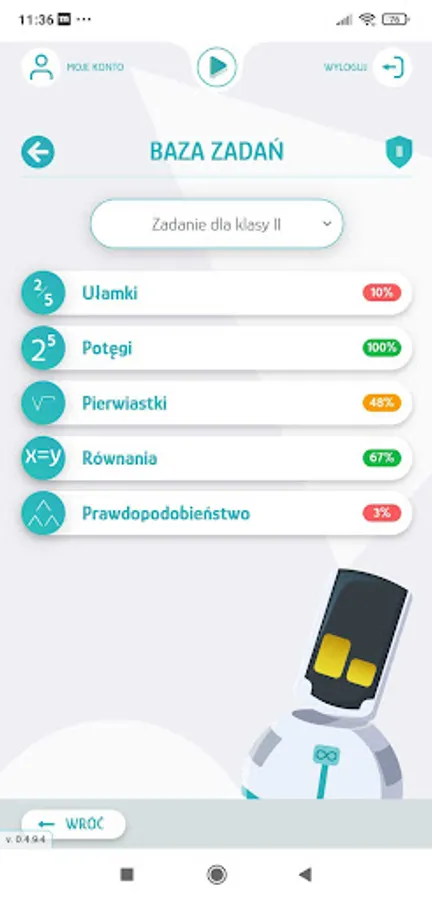 You don't have to plan your studies or choose tasks, the application will do it for you. The application also adjusts the level of difficulty of tasks to individual needs, if some area of mathematics is problematic for you, you start with easier tasks, and then the level of their difficulty increases with your achievements. In addition, after giving the answer, you can check how to solve the task correctly by watching the video tutorial.