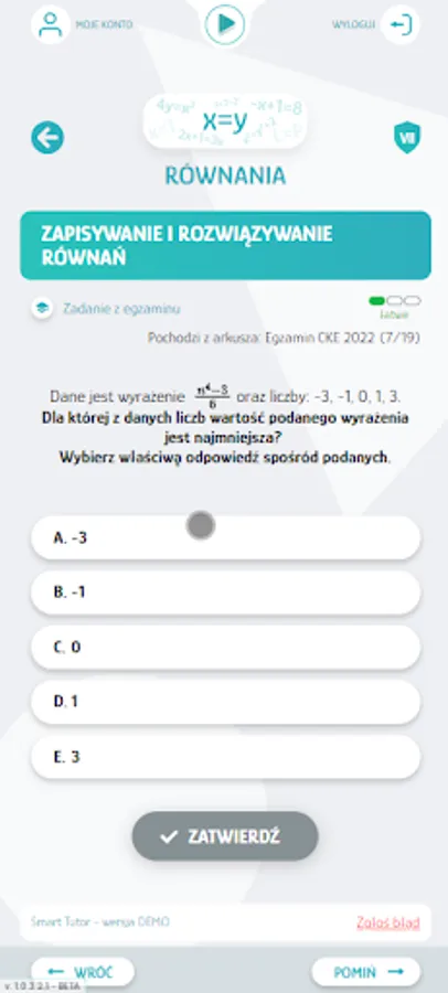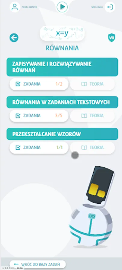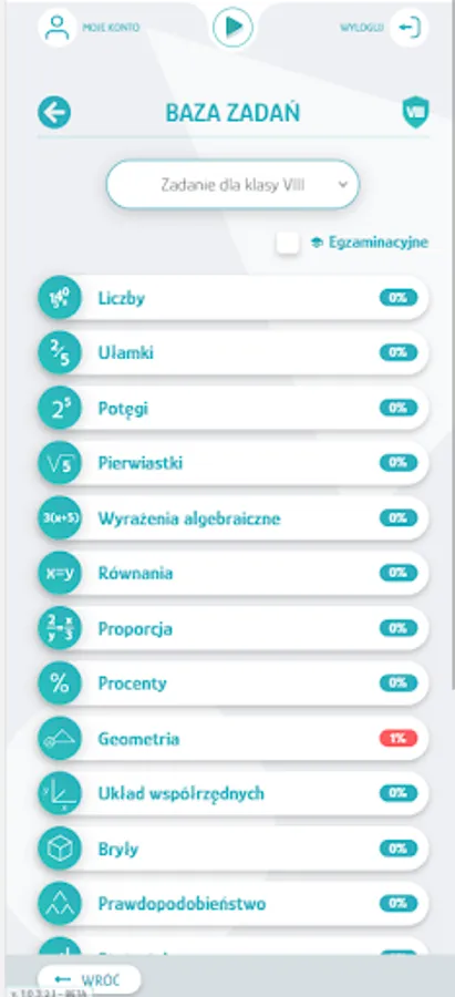 2/ Learning mode - task database - the user chooses which departments and issues he wants to learn. You have at your disposal a selection of video tutorials from theory as well as tasks for each topic covered in the eighth-grader exam.