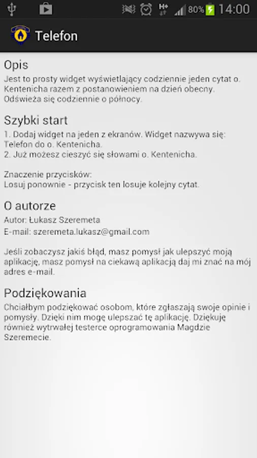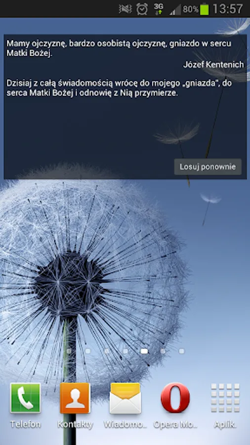 I present a simple widget that displays quotes about Kentenich together with the decision on the day. Application daily draws and displays a new quote and order.