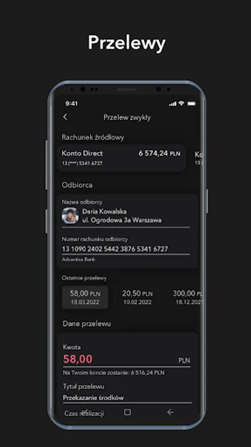 Ordinary, own, foreign, standing orders, with deferred payment, standard, express, using a QR scanner, hints about the planned delivery / recipient's bank and the last transfer made to a given recipient, easy search