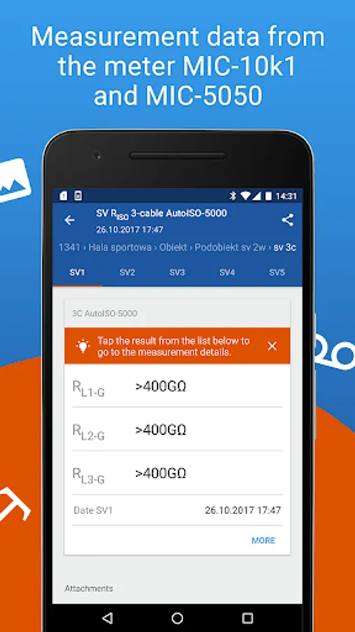 Mobile version of the program cooperating with the insulation resistance meters MIC-10k1/15k1 and MIC-5050. With the application you can connect directly to the device via bluetooth and download the measurement data from the meter. After reading the measurements from the instrument, they can be easily and quickly viewed, but also send to a person who can help interpret the data or perform a measurements documentation. From the application level we also have access to the meter user manual.