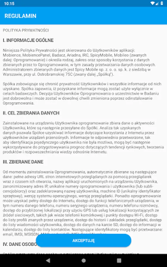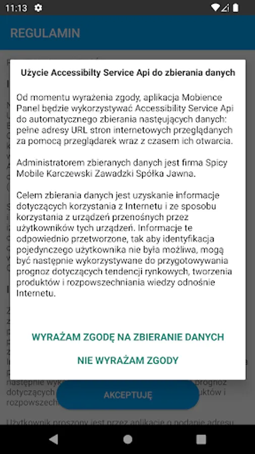 The Mobience Panel application uses the Accessibility Service Api to automatically collect the following data: full URL addresses of websites viewed using browsers along with their opening time.