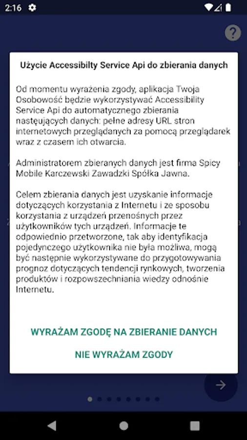 Your Personality application uses the Accessibility Service Api to automatically collect the following data: full URLs of websites viewed by browsers along with the time they were opened.